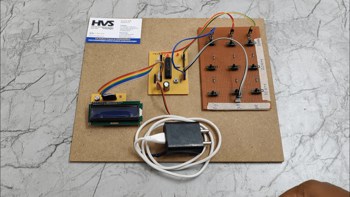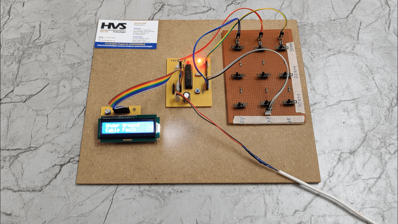 The project is assembled with a set of resistors representing cable length in KM’s and fault creation is made by a set of switches at every known KM to cross check the accuracy of the same. The fault occurring at a particular distance and the respective phase is displayed on a LCD interfaced to the microcontroller.