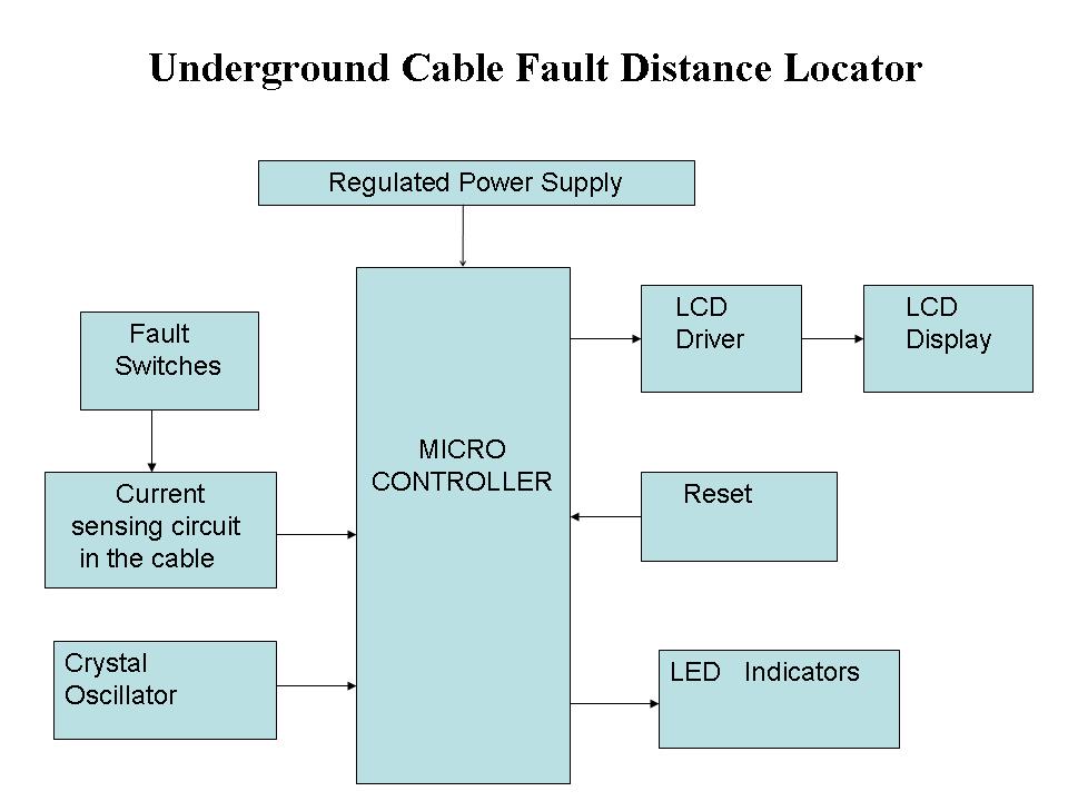 The project uses the standard concept of Ohms law i.e., when a low DC voltage is applied at the feeder end through a series resistor (Cable lines), then current would vary depending upon the location of fault in the cable. In case there is a short circuit (Line to Ground), the voltage across series resistors changes accordingly, which is then fed to an ADC to develop precise digital data which the programmed microcontroller would display in kilometres.