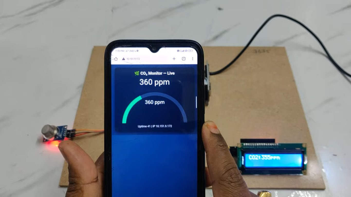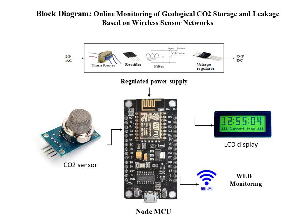The project “Online Monitoring of Geological CO₂ Storage and Leakage Based on Wireless Sensor Networks” aims to develop an intelligent and reliable system for real-time detection and monitoring of CO₂ concentration in geological storage sites. The system utilizes a CO₂ sensor interfaced with a NodeMCU (ESP8266) microcontroller to continuously sense and record carbon dioxide levels. The data is displayed locally on an LCD module and simultaneously transmitted via Wi-Fi to an online web server for remote monitoring and analysis. A regulated power supply ensures stable operation of all components. This wireless monitoring approach enables early detection of CO₂ leakage, ensuring environmental safety and efficient management of underground carbon storage facilities. The proposed system reduces the need for manual inspection, enhances data accessibility, and contributes to sustainable carbon capture and storage (CCS) practices.