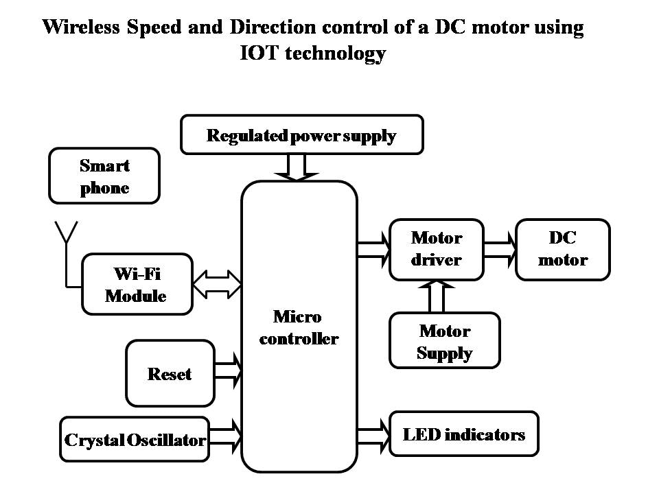 The project aims at designing a system, capable of controlling speed and direction of a dc motor wirelessly through a remote control. IOT wireless technology is employed in the project.