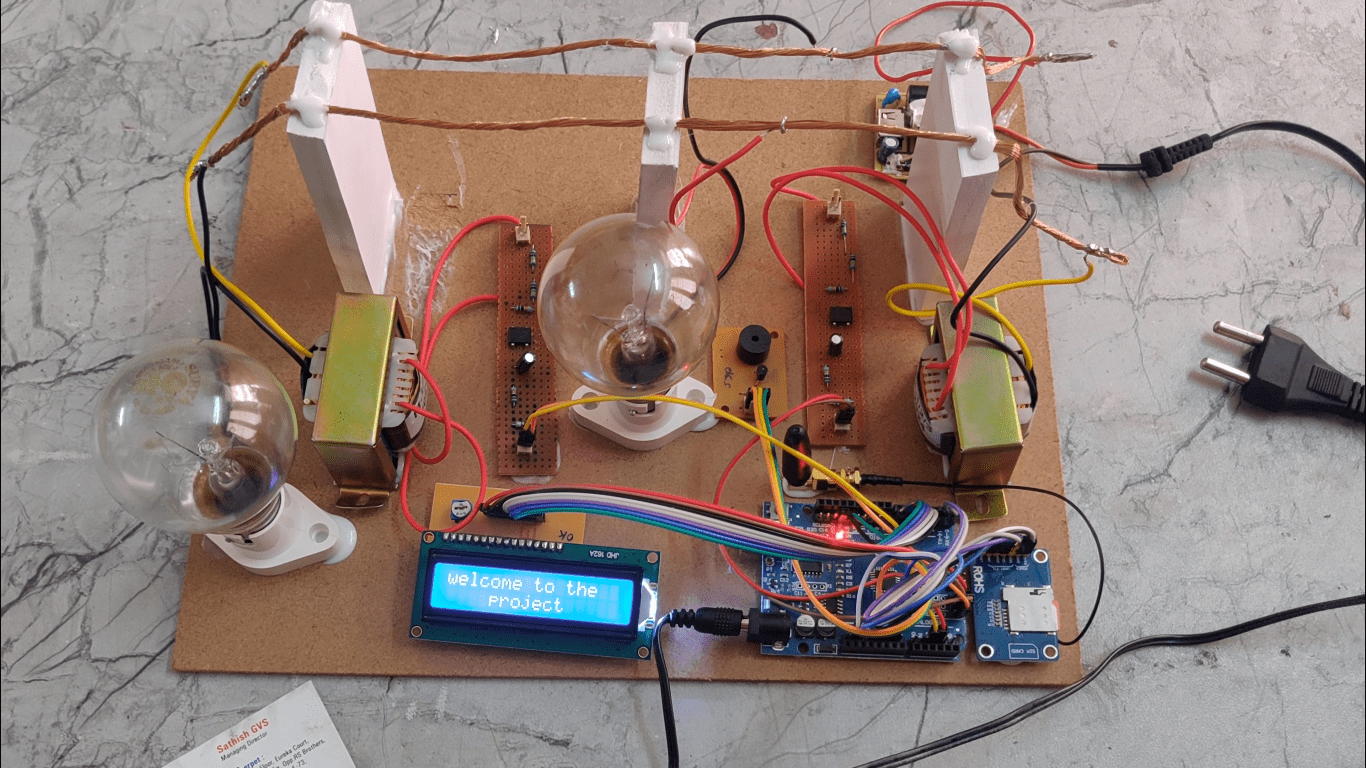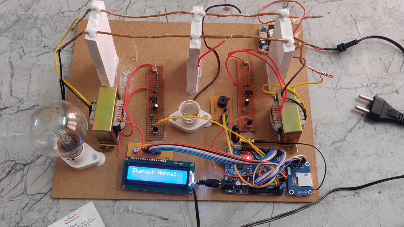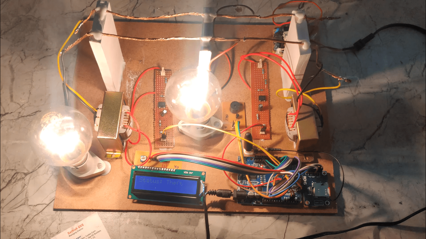 The concept involved in the system is to measure the current flowing in the energy transmission line at sensitive areas, sensitive area is defined as where the transmission lines are passing very near to a village or passing over an agriculture field and people are tapping energy to run the pump sets. At these areas the current is measured with two CT’s (Current transformers), these CT’s are arranged at either side of the sensitive area, in series with phase. Now the current flowing through the CT primary is converted into digital and is fed to microcontroller. The controller displays the current in amps, since two CT’s current is to be measured; two CT are designed with microcontroller unit. CT1, which is supposed to be installed at starting point of particular zone, can be called as master unit. The CT2 can be installed at other end of that particular zone, the current flowing through this unit CT2 is transmitted in digital form. The Arduino will receive this data and displayed onto LCD. The data acquired through wired is compared with master CT1 output and difference is displayed in separated row. The current flowing through both the CT’s is almost equal, line loss is considered, whenever the energy is tapped between the two CT’s, more current is passed through first CT, and the system is programmed such that when the difference is more than3-4% approximately, system energizes the alarm automatically and using relay to on and off the theft. If the system detects energy tapping it will send alert SMS through GSM and activate the buzzer for alerts. The status of the project will display on LCD module.