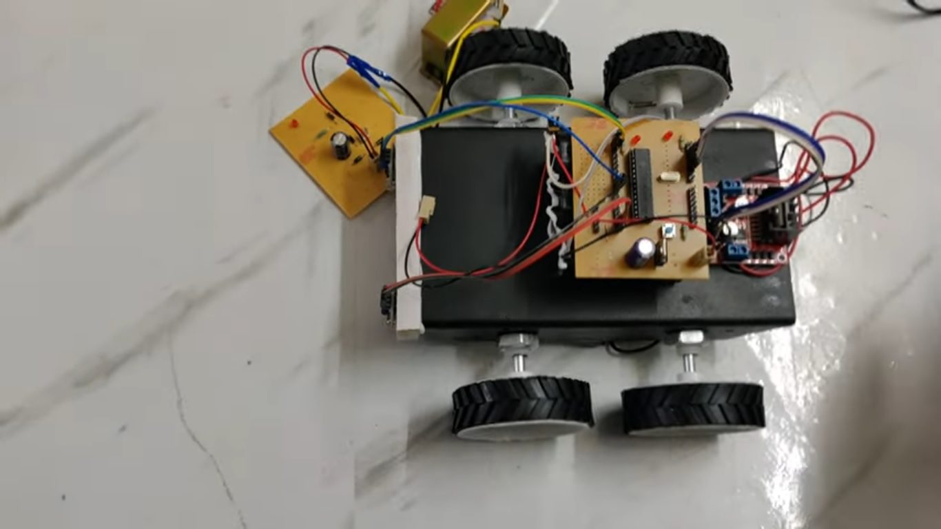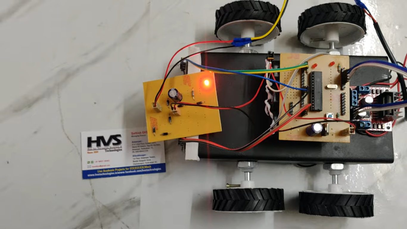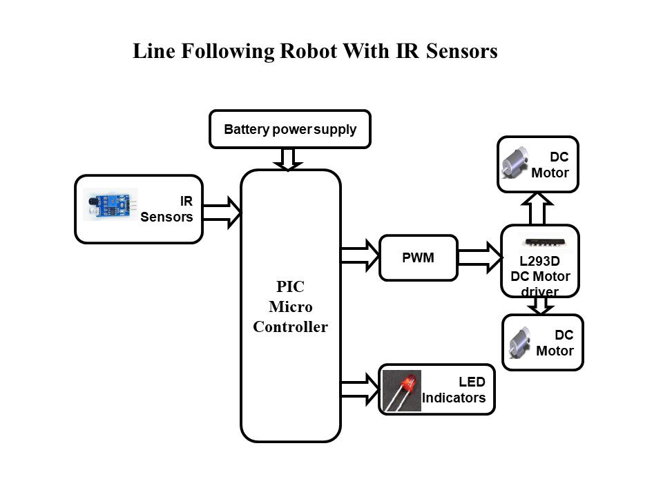 The robot uses IR sensors to sense the line; an array of 2 IR LEDs (Tx) and sensors (Rx), facing the ground has been used in this setup. The output of the sensors is a digital signal which depends on the amount of light reflected back, this signal is given to the PIC Microcontroller.