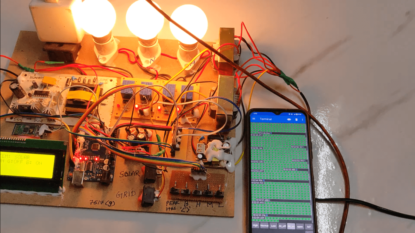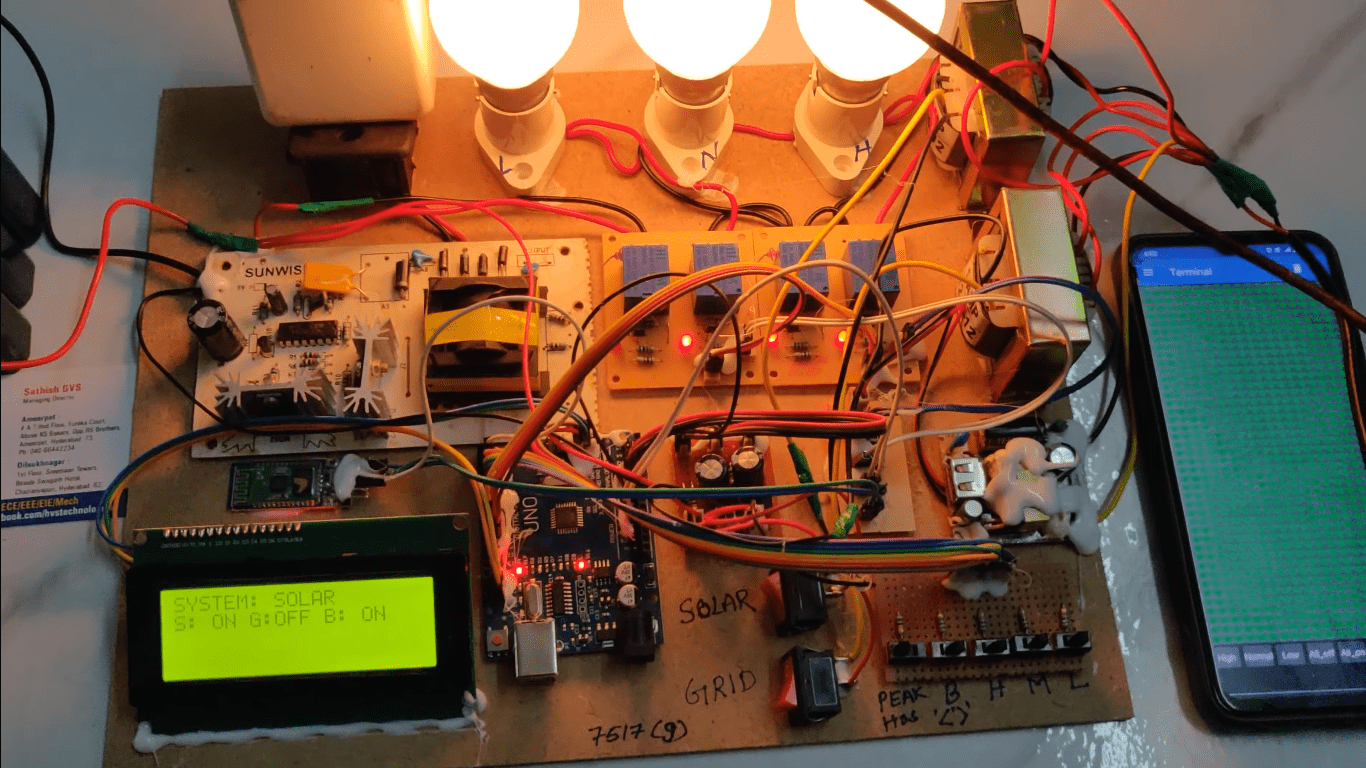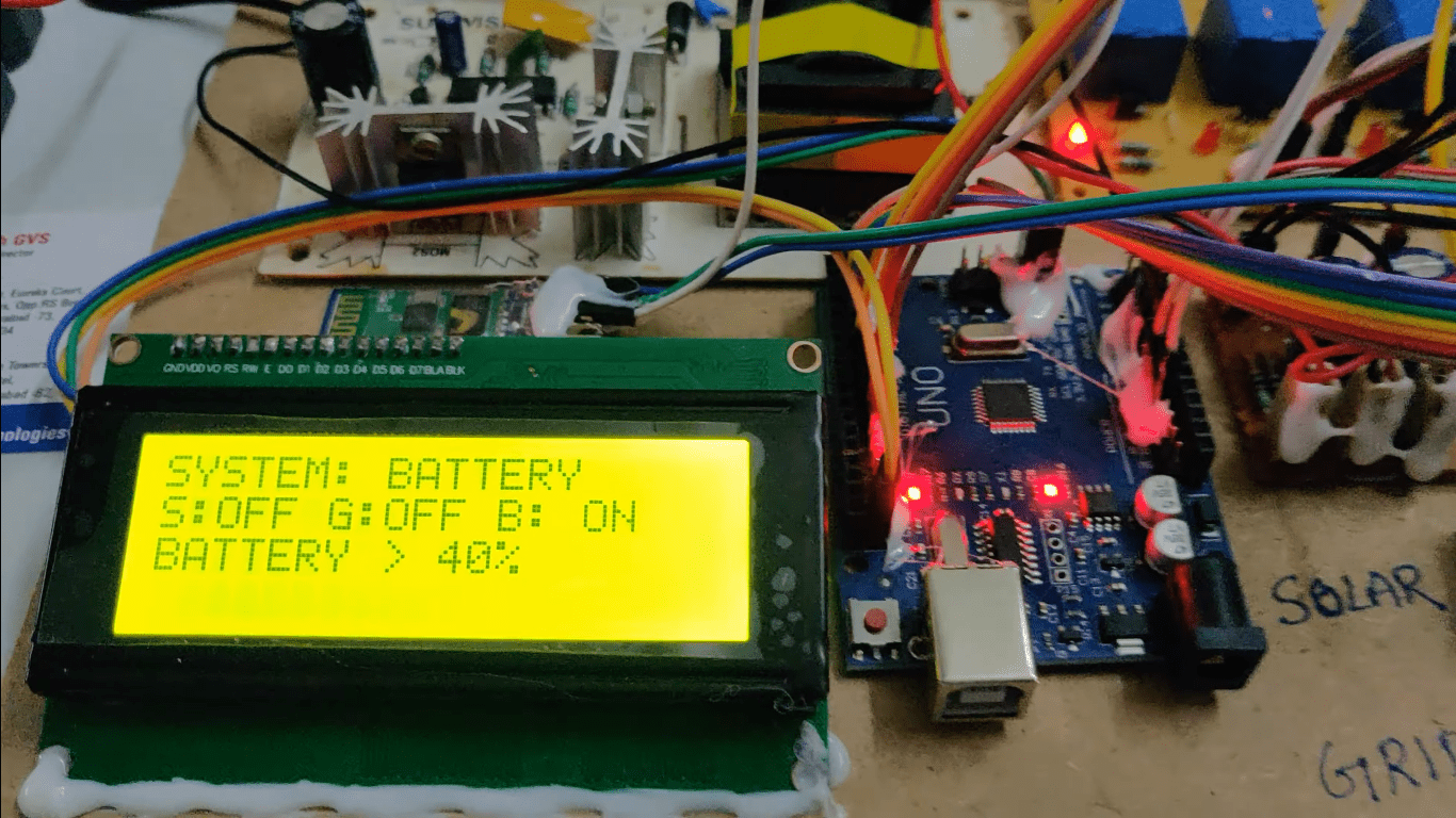 In this project you will learn that how to make smart hybrid energy management system using Arduino so here working principle of this project so let me explain it .we have three power sources one is solar the second one is grid and the third one is battery so our first priority will be the solar and if solo is not available then second priority will be the grid and if grid is also not available so the third product will be the battery so this means that when solar and grid is not available then the load will be transferred to the battery and if solar and grid is available then our first priority will be the solar that all the load will be connected to the solar and if solo is not available so if solar is available then high priority normal priority and low priority load will be connected with the solar power and if there is no solar power then the power will be transferred to the grid now indeed there are two conditions one is that whether they are peak hours or not so if there are peak hours then only the high priority and Nano priority load will be connected with it the low priority load will not be connected with the grid so if there are no big hour then the hybridity normal priority and low  priority load will be connected with the grid now the third option is the battery if both of these power are not available then load will be transferred to the battery so there are also two condition battery whether the battery is a less than 40 percent or not so if battery is less than 40 percent then only hybridity and normal priority load will be connected with it and if a battery is greater than 40 percent so high priority non-variety and low priority load will be connected with it. So this the Arduino UNO the Bluetooth module this is the reset button for resetting the system this is the LCD module the details on it here the air channel rear modules the first relay is for the solar the second one is for the grid and the third one is for the neutral wire this is for the battery phase wire and neutral wire and the last three layers for the controlling of the load control the high priority normal priority and low priority and this button is for the solar grid and Battery this is the main Supply wire this is the step down transform this also disturb down transformer this is the bridge capacitor and then resistors same .here Bridge capacitor resistors this is for sensing the voltage this is also for sensing voltage this is for sensing solar voltage grid voltage this is for sensing battery voltage this is high priority load this is normal priority load and this is low priority load this is the 12 volt battery and this is the inverter connected with it these buttons are for controlling the load this is for high priority number priority and no priority load this means that we can manually control the load with these buttons this button is for manually creating the peak hours and this button for manually creating battery less than 40 percent this is just for the demo purpose because we can't wait for the peak hours and the battery to be less than the 40 percent.