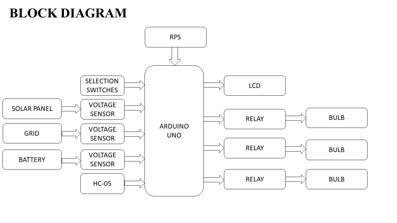 In this project you will learn that how to make smart hybrid energy management system using Arduino so here working principle of this project so let me explain it .we have three power sources one is solar the second one is grid and the third one is battery so our first priority will be the solar
