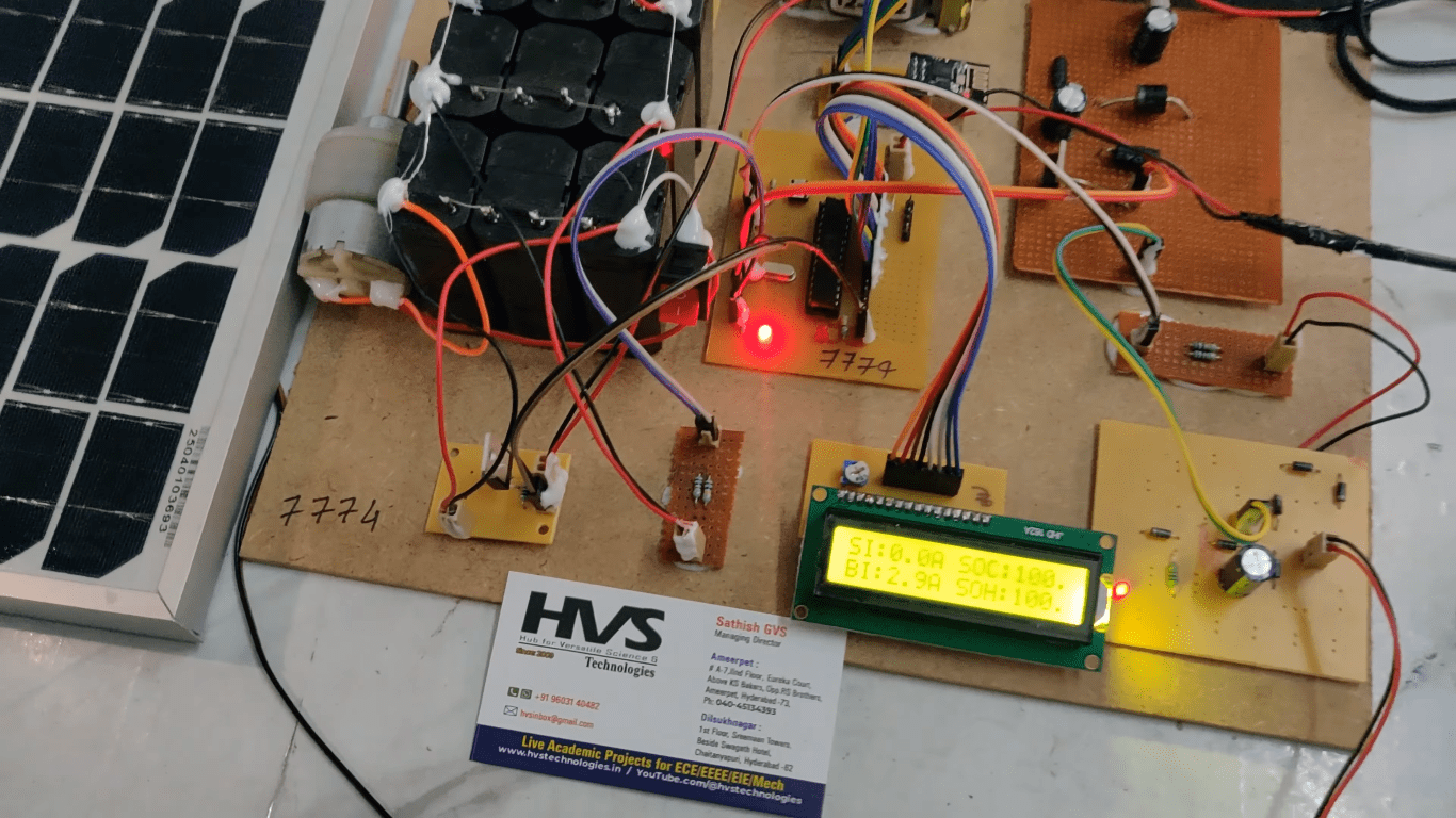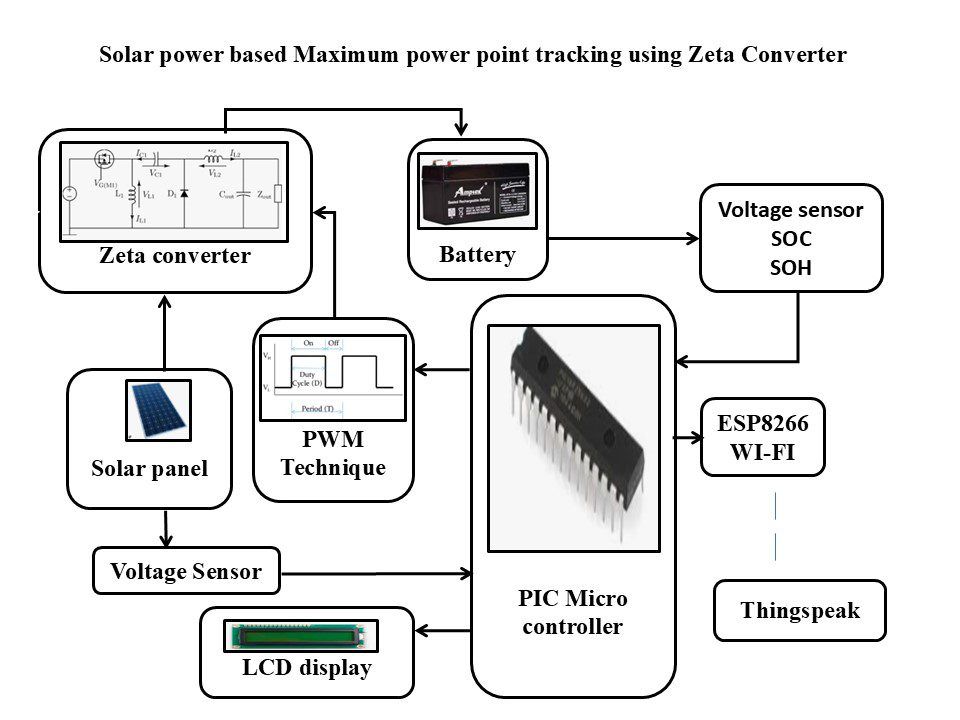 A PIC microcontroller is employed to implement the MPPT algorithm by dynamically controlling the PWM duty cycle of the ZETA converter. Voltage sensing circuits continuously monitor solar panel and battery voltage to ensure accurate power regulation. The system calculates the State of Charge (SOC), State of Health (SOH), and the estimated time required for the battery to reach full charge, enabling comprehensive battery condition assessment.
