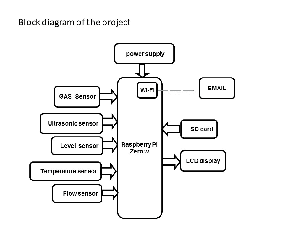 The project makes a use of water level sensor, water flow sensor, SR04 ultrasonic sensor, Temperature sensor, Gas sensor and raspberry pi zero w processor.