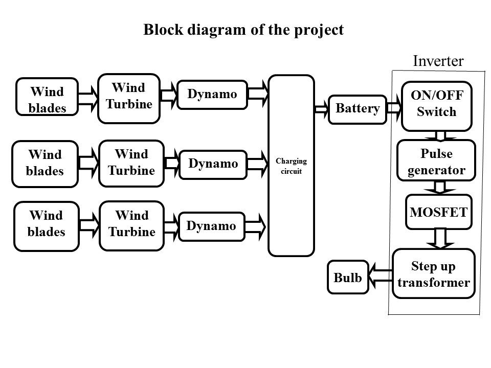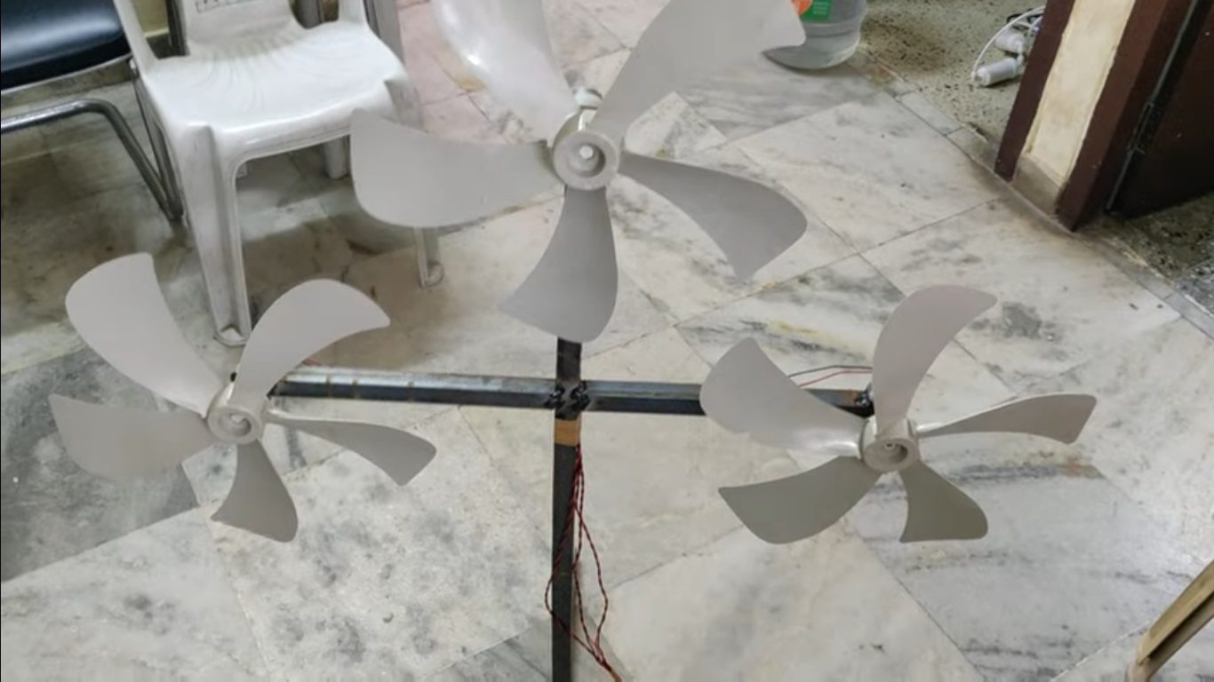 Today, among the various renewable energy sources, wind power is the primarily acknowledged and confirmed its cost effectiveness. Globally, wind power utilization is increasing at noticeable rate. Continuously the technology is enhancing in order to obtain more power output from wind turbines. As the wind power output is proportional to the swept area of wind turbine, the rotor size is increasing continuously with grown-up capabilities of engineering and technology. On the other side, increasing rotor size generates some problems. To solve these problems, we proposed a multi-rotor wind turbine system also offer the advantage of standardization, transportation and ease of installation and maintenance. In this we are using three turbines with wind blades, three dynamos constricted with parallel. The wind energy obtained is stored to a battery through charging circuit. The battery supply is fed to pulse generator and in turn to a MOSFET which is capable of generating ON/OFF pulses of different frequencies. This is fed to a step-up transformer to generate a low voltage AC. This AC is fed as to the load.