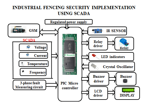The main aim of the project is to design an industrial fencing security implementation system using SCADA along with three phase fault detection system. The system also detects and alerts the user through SMS messages using GSM modem.