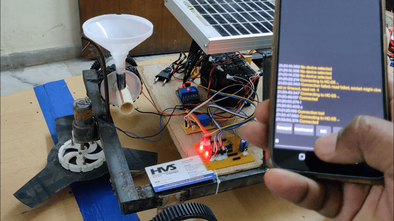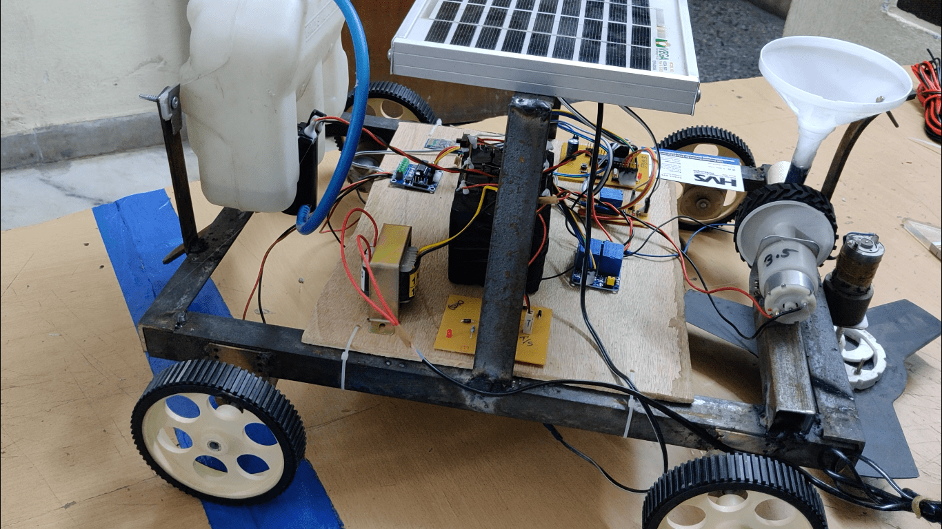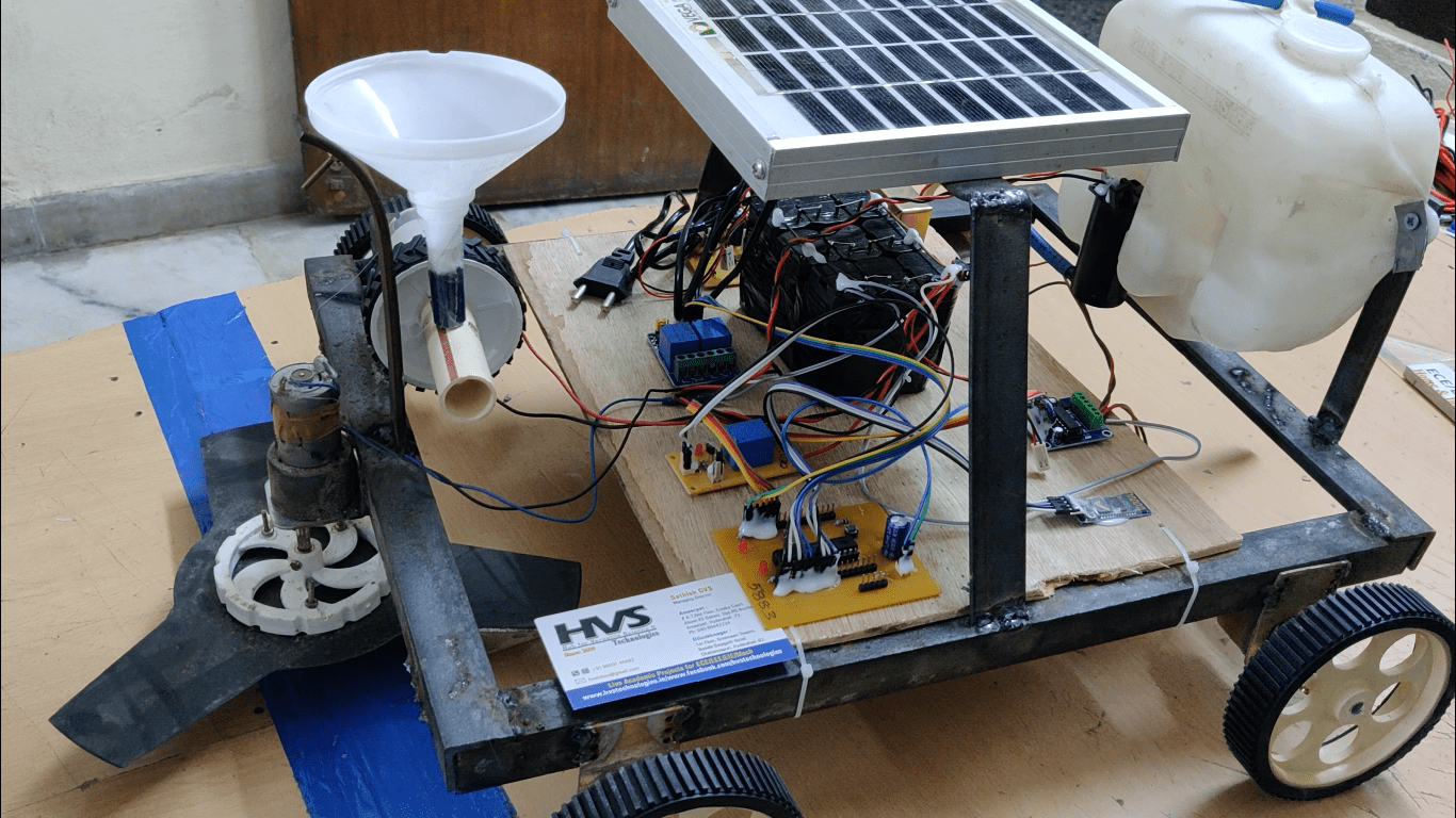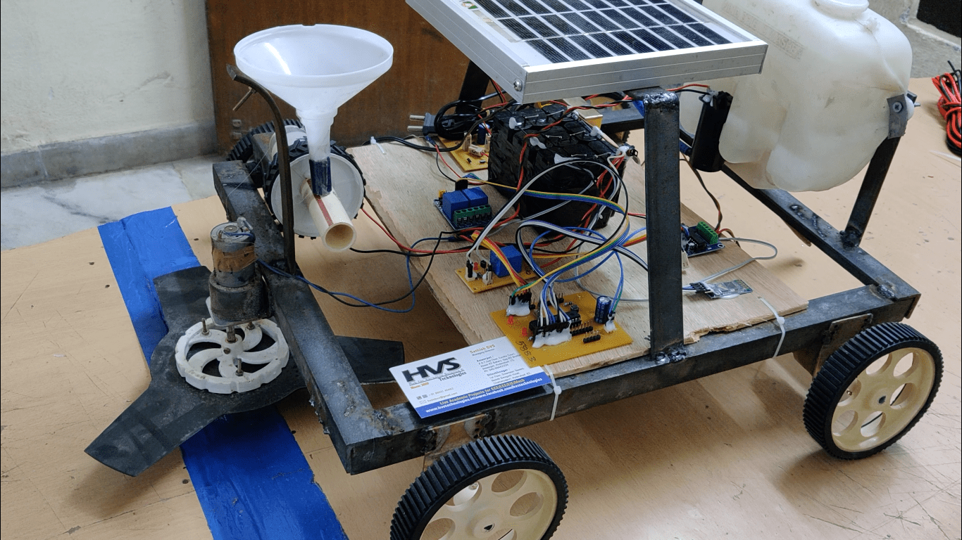 HVS-3190. Solar powered Multipurpose AgriBot through Bluetooth Seed sowing, Watering, ploughing and grass cutting
