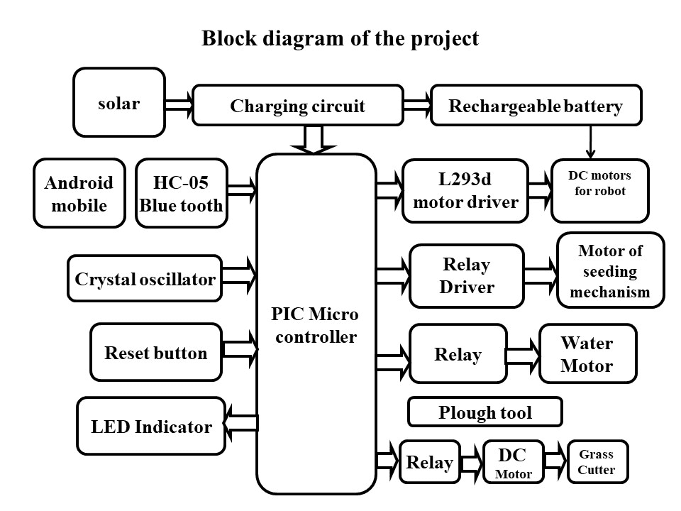 Bluetooth Seed sowing, PIC, ploughing grass cutting, Watering