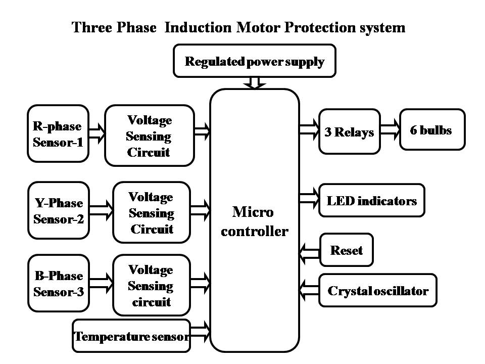 This system consists of three voltage sensing circuits for sensing the presence of high voltage in the respective circuits. One of the voltage sensors is connected to phase line of the supply and the other is connected to neutral line. Temperature sensor is uses to detect the temperature. A microcontroller based control system continuously monitors the temperature,voltages in all the three phases of the power supply circuit. But, when any of the phase gets disconnected then in such situations the microcontroller will isolate the three phase power through relays. In this we are using three switches to create a fault manually.