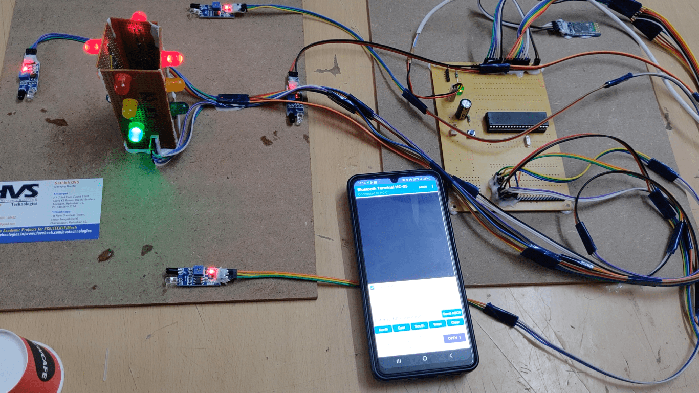 In this project, when more vehicle density is identified by the IR sensors in a particular side, then green light gets ON automatically. It remains in ON state for a predefined amount of time. After the predefined amount, the signal turns to red.