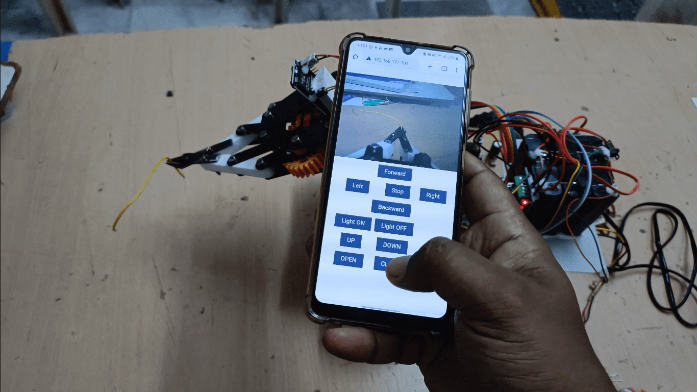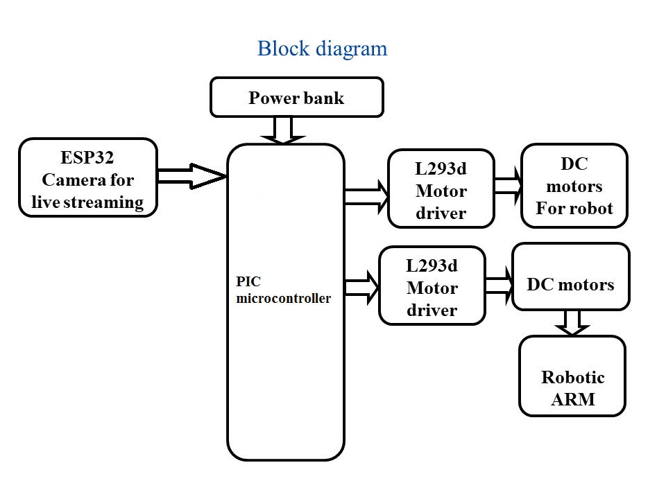 The controlling device of the whole system is an ESP32 camera. Whenever the user presses a button from WEB application, the data related to that button is sent through WI-FI. This data will be received by ESP32module in the robot system which judges the relevant task like bomb diffuses using robotic arm and controlling the robot direction through DC motors. The esp23 camera used in the project are programmed using Embedded C language.