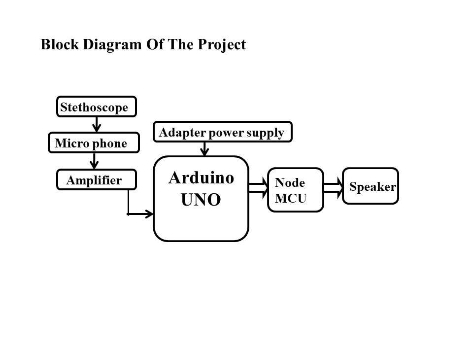 In this project, we are interfacing Stethoscope to the Arduino via microphone and amplifier. Arduino will convert the body sound into analog signal and send this signal to the NodeMCU. Node MCU will converts this analog signal into tone and sent through speaker.