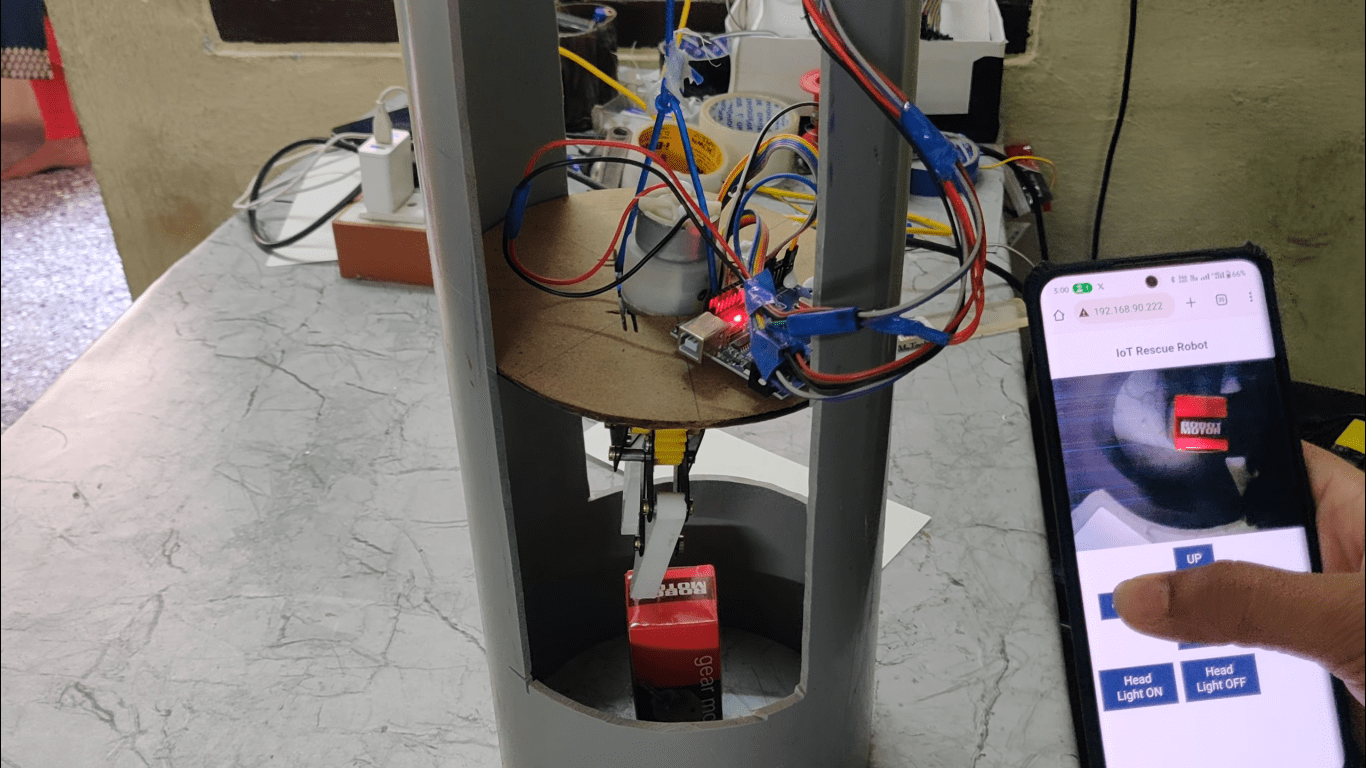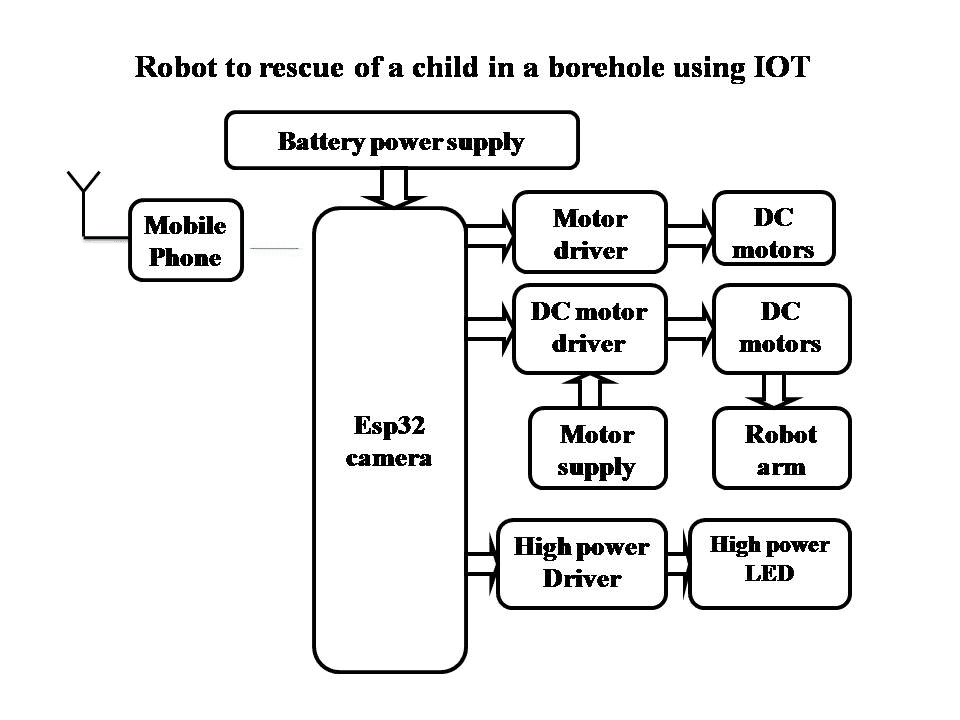 The project aims in designing a “Robot to rescue of a child in a borehole” which is capable of moving inside the pipe according to the user commands given from mobile while seeing the video using esp32 camera. This project consists of robotic arm to pick up the child from borehole and it has high power LED which acts as a light source inside the pipe.