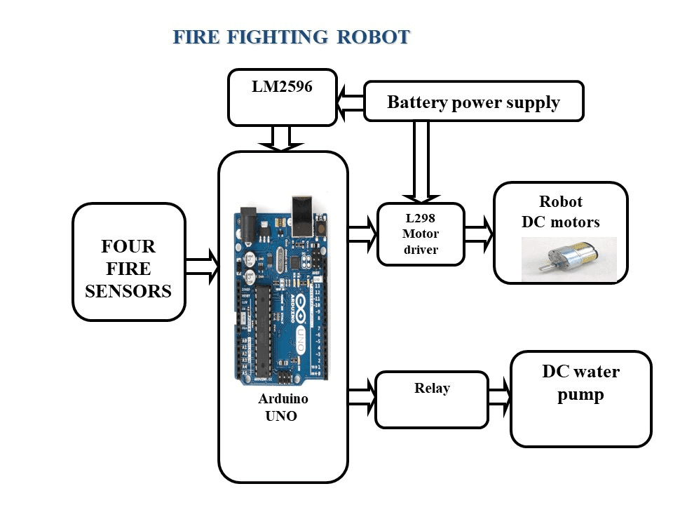 This project makes use of four fire sensors which we place the four sides of the robot to detect the fire. Water motor long with relay is uses to spray the water if the sensor detects the fire. Here relay works as a switch to ON/OFF the water motor. DC motors long with l293d motor is uses to moves the robot.