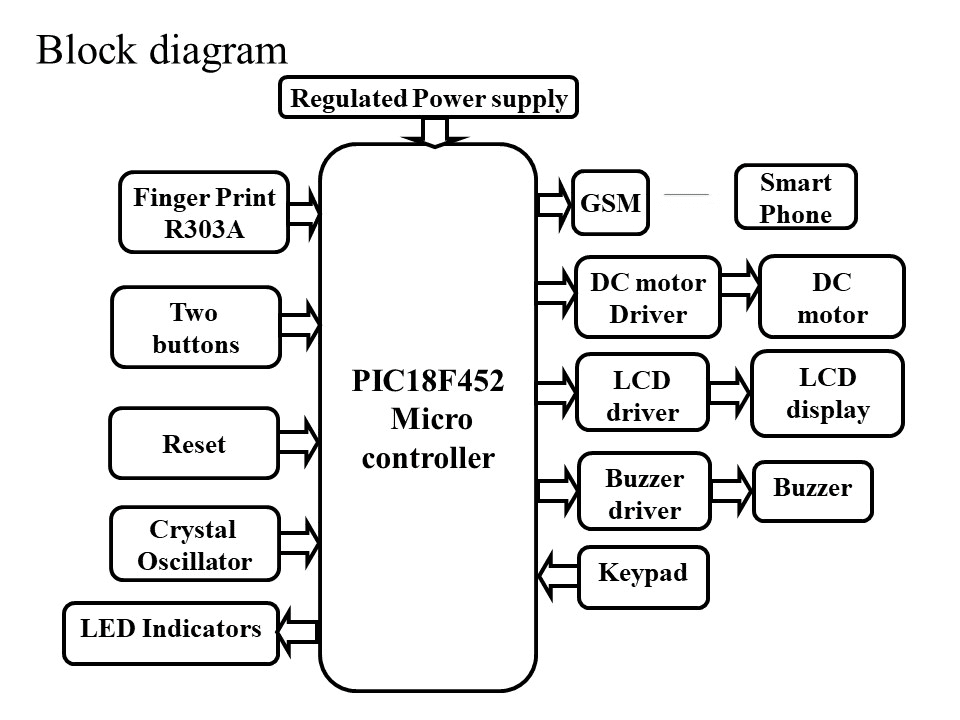 To access the vehicle user, place the finger-on-finger print module. Microcontroller will check the fingerprint with the stored fingerprints. If the finger print matches, this system will access the vehicle ignition automatically and it sends a message to the owner that the vehicle ignition is ON. If the finger print was didn’t match then it send a OTP(one time password) to the registered mobile number through GSM modem, the customer in turn needs to forward the same code through keypad, once the code is forwarded by the user, the controller checks the received code with the generated code. If it is matches this system will access vehicle ignition, otherwise it’s not possible. Bazar comes when wrong password or wrong fingerprint is detected by the microcontroller. The status of the project will display on LCD module. Here DC motor works as vehicle. Two push buttons are uses to store and delete the finger prints into the finger print module. To achieve this task microcontroller loaded program written in embedded C language.