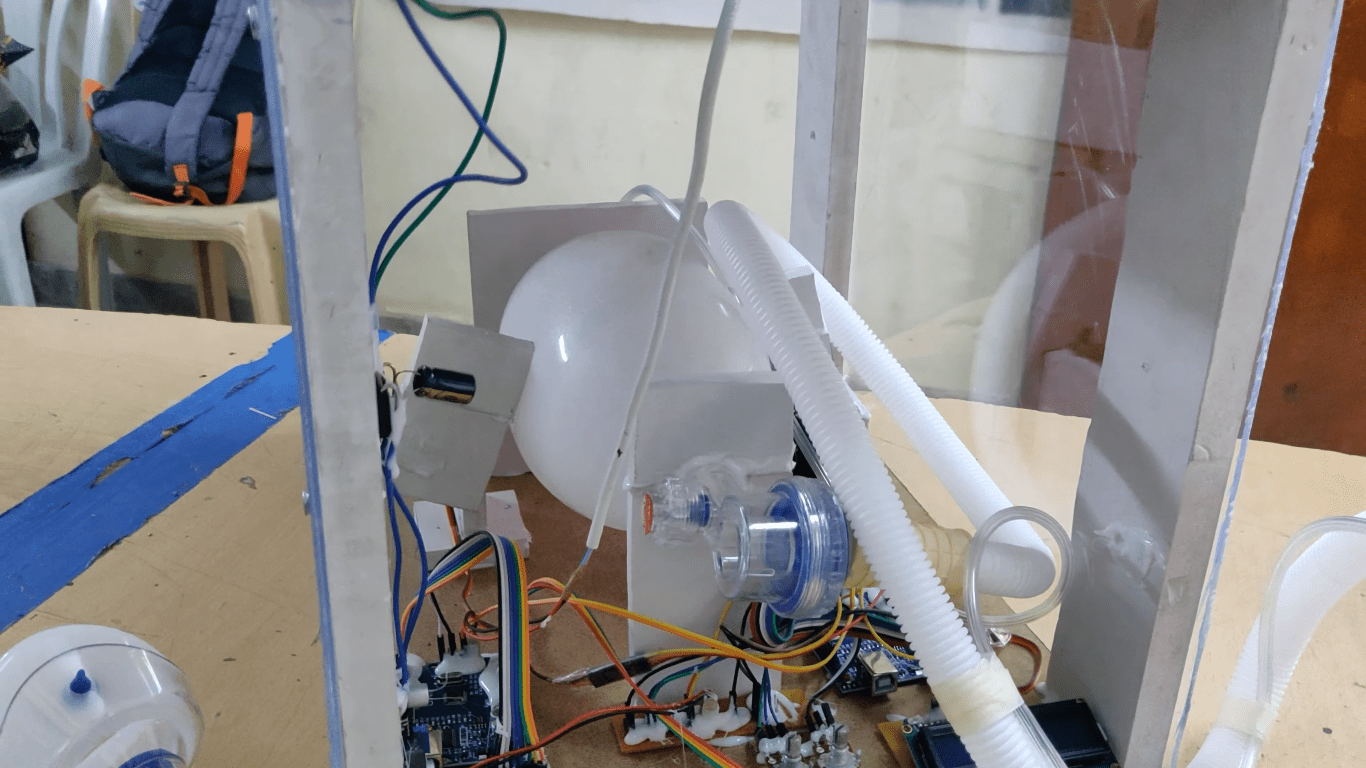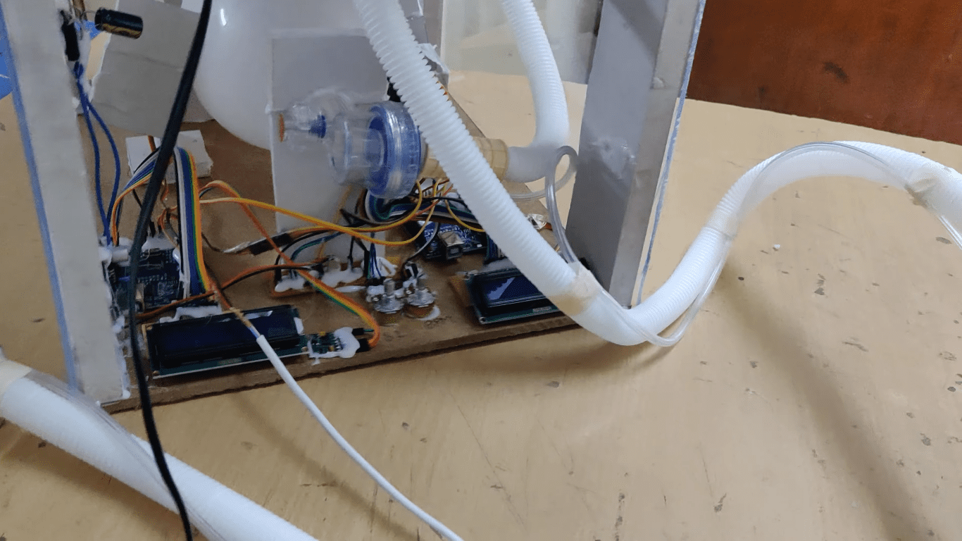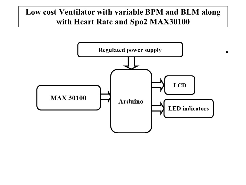 The project aims in designing a low-cost ventilator wherein we can manually set the value of breath length and breadth per minute values through potentiometers, depending on which the servomotors interfaced are used for inhale and exhale operation of air.   There is an increase in air pollution which resulting in various respiratory diseases. Some of the respiratory disease’s patients require the instant support of ventilator and also there has been a drastic increase in the number of patients struck by COVID-19 pandemic in the hospitals and ICUs worldwide. However, sufficient ventilators are not available in the hospitals at present. An influential report from Imperial College London estimates that 30% of patients admitted in hospitals due to COVID-19 are expected to need the mechanical ventilation. According to the WHO, one in six COVID-19 patients has significant difficulty in breathing and may require ventilator support. However, the patients who require ventilator support have low survival rates of 20% because many of these infected patients (40%) develop acute respiratory distress syndrome (ARDS), which has a high mortality.   A servo motor is a type of motor that can rotate with great precision. Normally this type of motor consists of a control circuit that provides feedback on the current position of the motor shaft, this feedback allows the servo motors to rotate with great precision. If you want to rotate an object at some specific angles or distance, then you use a servo motor. It is just made up of a simple motor which runs through a servo mechanism. The controlling device of the whole system is Arduino. There are two Arduino microcontrollers here. In the first section as mentioned below, the Arduino is used to read MAX30100 sensor data of the patient and display the same on the LCD. In the second section, the Arduino reads the values from both the Potentiometer values i.e., breath length and breadth per minute(BPM). Servomotors are controlled accordingly depending on those values thereby implementing the inhale and exhale operation of air. The Arduino is programmed using Embedded C language.