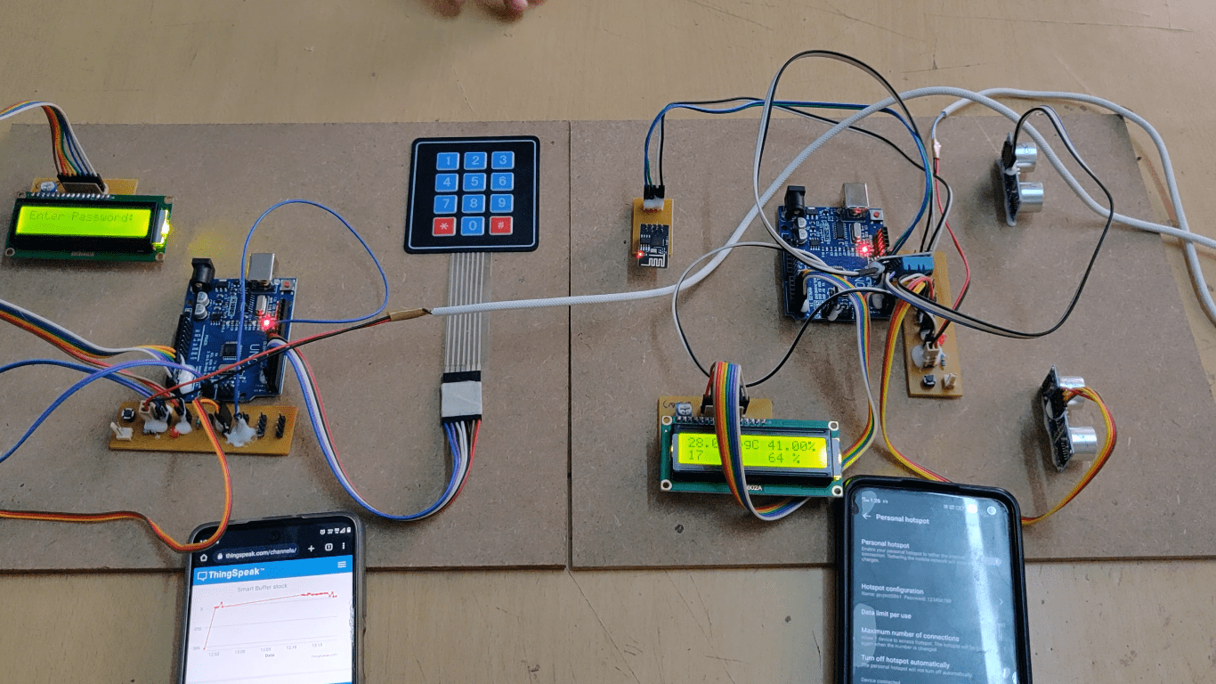 This system monitors the amount of capacity used in given Buffer Stocks at various locations on a dashboard. It also provides a rough estimate of the weight of the stocked food.