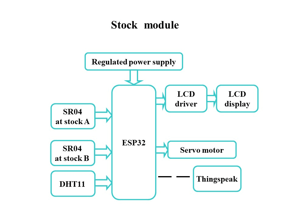 Stock section: This system makes a use of two ultrasonic sensors is uses to monitors the percentage of stock at various locations. DHT11 is uses to monitor the temperature and humidity values. LCD is uses to display the percentage of stock, temperature and humidity values. ESP32 module has inbuilt wi-fi is uses to upload the data into the thingspeak cloud along with date and time.