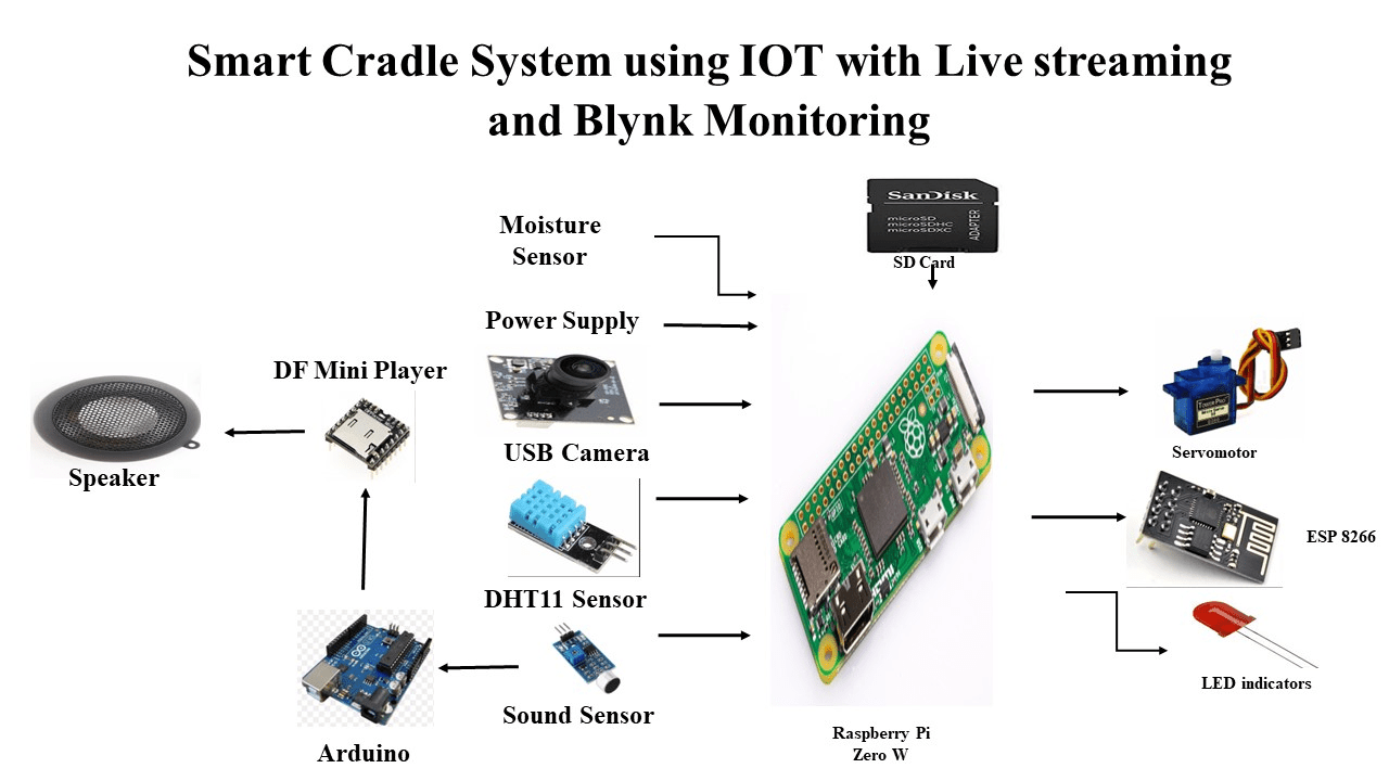 The processor is programmed in PYTHON language which intelligently performs the specific task. The system detects humidity and temperature of the surroundings near cradle. The USB camera gives the live streaming about the baby in the cradle. The sound sensor attached senses the sound of the baby and gives signal to the Arduino. Arduino activates the DF mini player which inturn plays soft music stored in MMC Card through speaker. When the baby is crying which is detected by the sound sensor, the Raspberry Pi turns ON the servomotor and moves the cradle. Wetness sensor is also used to sense the wetness in the cradle to ensure the hygiene condition of the baby. All the four parameters are sent to the blynk app. Also we can see the visuals of the baby in cradle through web browser.