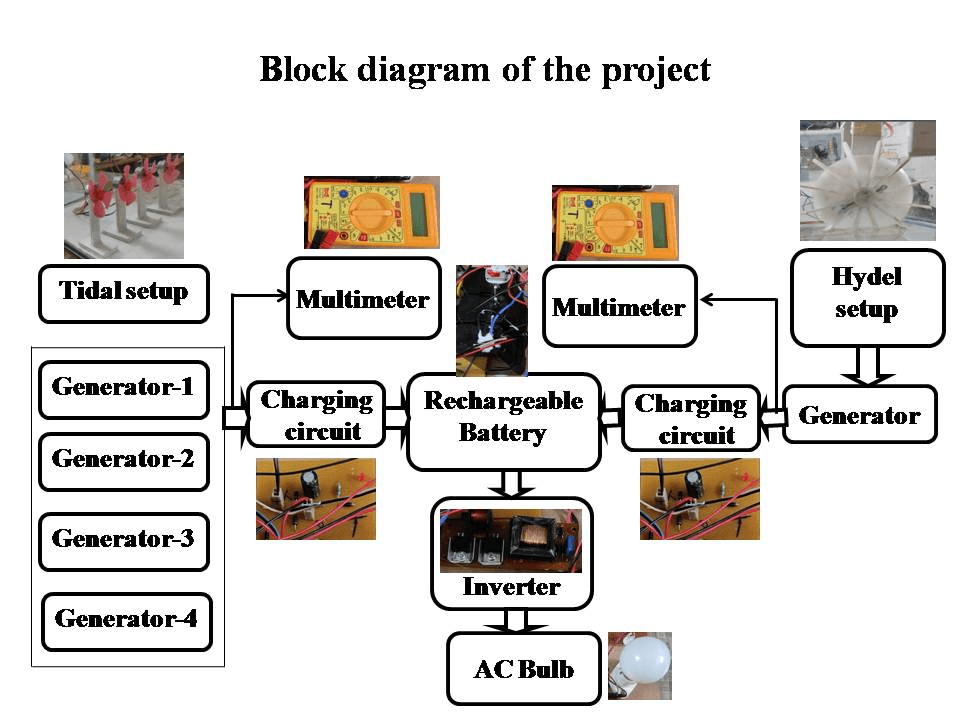 The project makes a use of generators which converts mechanical energy into electrical energy. hydel, tidal and solar energy is obtained stored into the battery through charging circuits. We can measure the generated voltage in a multilmeters.