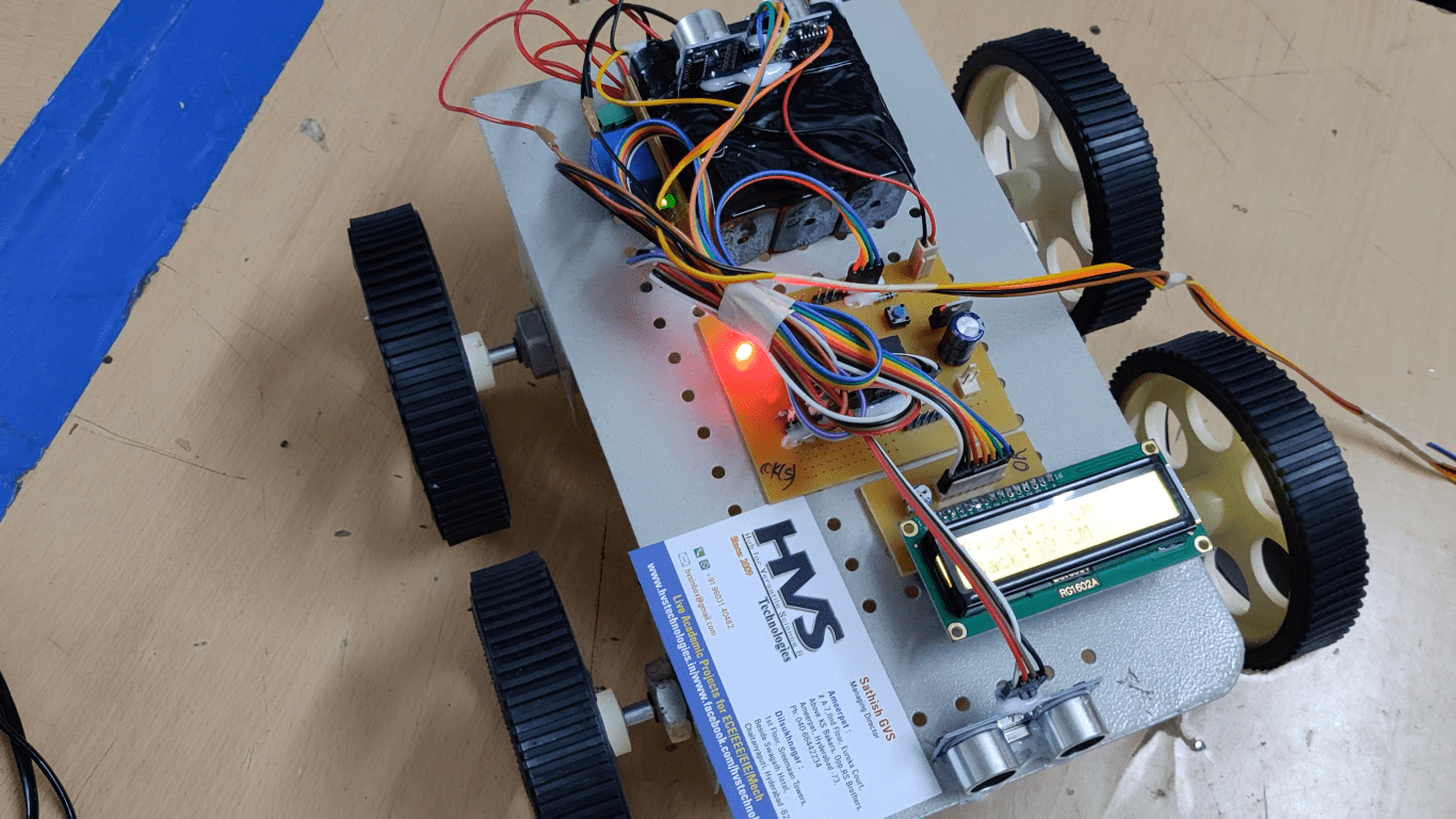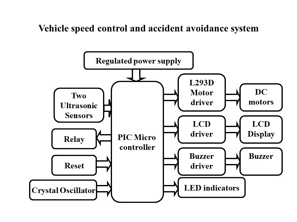 The project aims to design an intelligent system that helps in preventing road accidents by alerting the driver and automatically controlling the speed of a vehicle when an obstacle is detected. Road accidents are continuously increasing in day-to-day life due to various reasons, including vehicle chasing and collisions. To minimize such accidents, precautionary methods are implemented using ultrasonic sensors. These sensors generate high-frequency sound waves and measure the time interval between sending the signal and receiving the echo to calculate the distance of an object. In this project, two ultrasonic sensors are mounted on the front and rear sides of the vehicle to detect obstacles. When an obstacle is detected, the distance is displayed on an LCD screen. If the obstacle is within 30 cm, the system automatically stops the vehicle and activates a buzzer to alert the user. A relay is used to cut off the power supply to the motor, ensuring immediate stoppage. The vehicle's movement is controlled by DC motors interfaced with an L293D motor driver. The entire system is controlled by a microcontroller, which continuously receives distance data from the ultrasonic sensors. When the detected distance is less than the predefined threshold, the microcontroller triggers the alarm and automatically controls the vehicle’s speed. The distance readings are continuously monitored and displayed on the LCD screen. The microcontroller is programmed using embedded C language to perform these intelligent tasks efficiently.