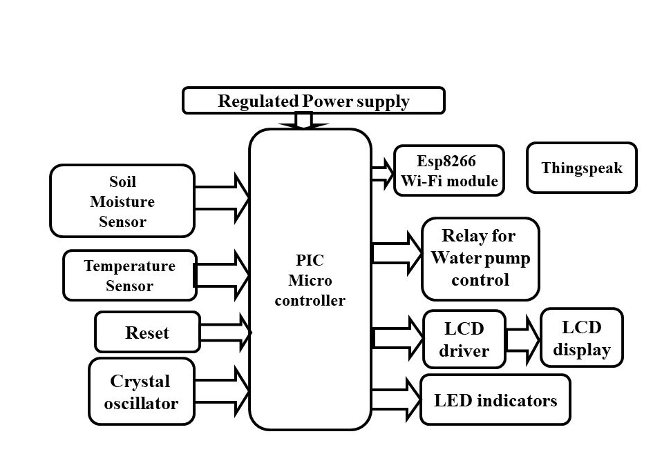 The project aims in designing a system which is capable of detecting moisture level in the soil and capable of taking the decision of switching ON/ OFF water pump. The system also uses temperature sensor to detect the temperature level and control the water pump automatically using Relay switch.   The system makes use of a Microcontroller. The output from soil moisture detecting probes sensor is fed to Microcontroller. The Microcontroller will continuously compare output from probes and reference voltage and generates logic low or high. The output generated from Microcontroller is used to drive a water pump through a Relay switch. And microcontroller will upload the sensor data into the thingspeak cloud through esp8266 wi-fi module also display the sensor data on LCD module. To achieve this task microcontroller loaded program written in embedded C language.