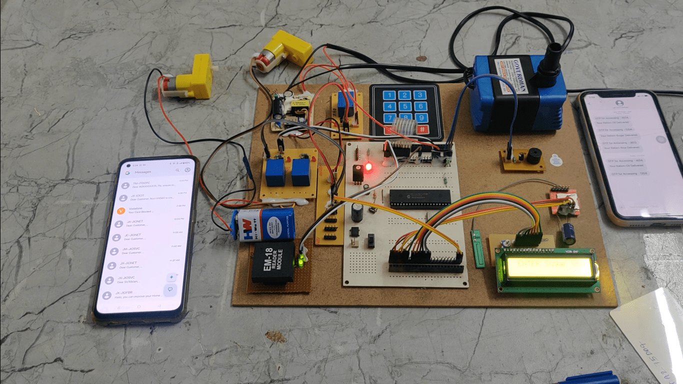 In this way, in the current situation we are facing problem of corruption in public distribution system. There is no such effective system through which government gets acknowledgement of consumption of food grains by people. RFID and OTP based Automatic Ration Dispensing System presented here is an advanced system useful for the efficient way of ration distribution. This project is designed to minimize the manual intervention in the process of ration distribution, so that more transparency & efficiency can be maintained. Our project focuses on design and implementation of Automation of Ration Shop using RFID and OTP. In this project, the proposed concept is to replace the manual work in public distribution system. The ration distribution system is automated by using PIC Microcontroller. This automated ration system replaces the conventional ration card system by RFID card. Â An RFID system consists of an antenna or coil, a transceiver (with decoder) and a transponder (RF tag) electronically programmed with unique information. Mainly in this project we are distributing rice, sugar and oil. This system consists of keypad to enter the OTP and quantity of rice, sugar and oil. The status of the project will display on LCD module. This system contains GSM module for sending the OTP to user mobile number and sending the conformation SMS after the food is distributed.
