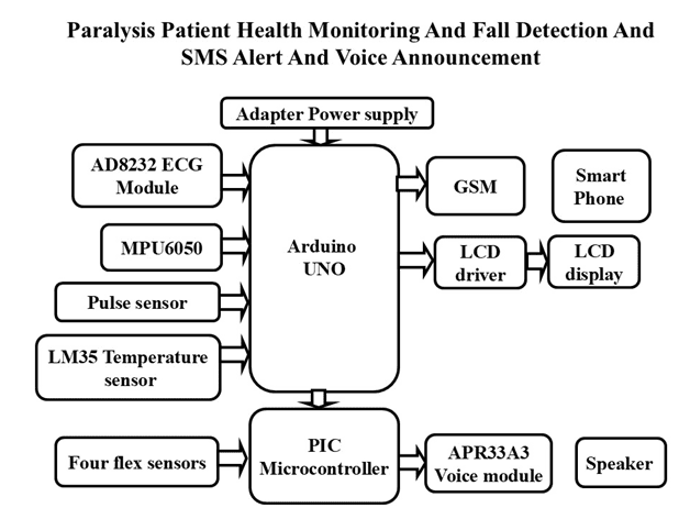 This project presents a health monitoring and assistive system designed for paralysis and physically challenged patients, integrating various sensors and microcontrollers to enhance patient care. The system utilizes an Arduino UNO microcontroller to continuously monitor vital health parameters such as ECG, body temperature, pulse, and movement through an MPU6050 gyroscope. If any parameter exceeds the predefined limit, an SMS alert is sent via a GSM module to notify caregivers. Additionally, the system incorporates flex sensors and a voice module connected to a PIC microcontroller to provide communication assistance, allowing patients to convey their needs through gesture-based input. The LCD display provides real-time feedback on the patient's health, making the system user-friendly. This innovative combination of medical monitoring and assistive technology offers an accessible solution to improve the quality of life for physically impaired individuals.