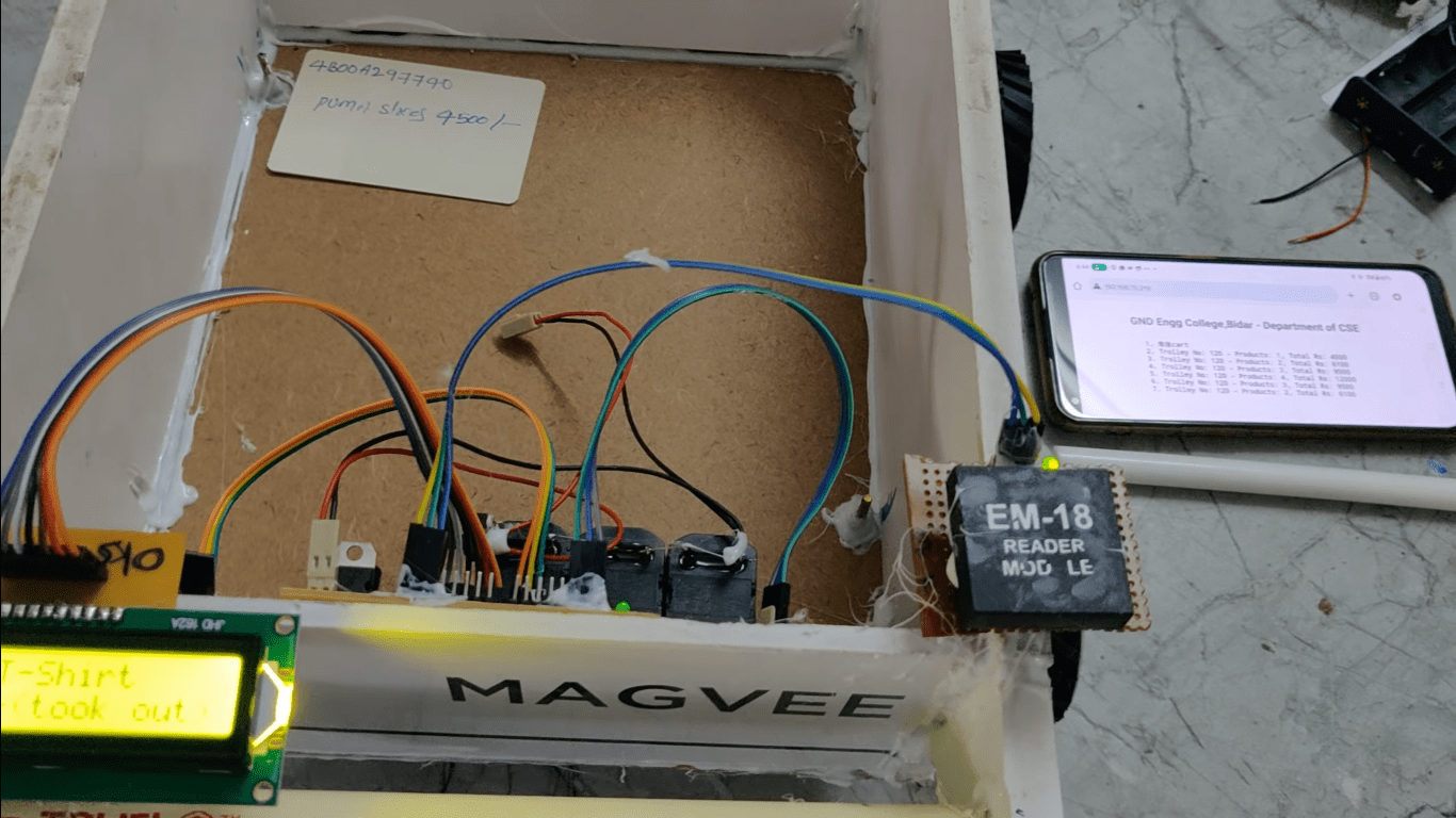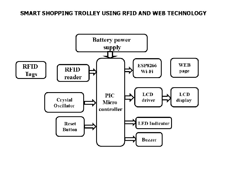 The RFID reader is interfaced with the microcontroller and RFID tag is attached to each and every good package. When the goods are placed in the trolley the RFID tags attached to the goods are decoded by the RFID reader interfaced to the microcontroller along with Buzzer and the information is stored and displayed on LCD. The system automatically sends the selected good number along with cost and bill into the WEB page using IOT technology. This system works with battery power.
