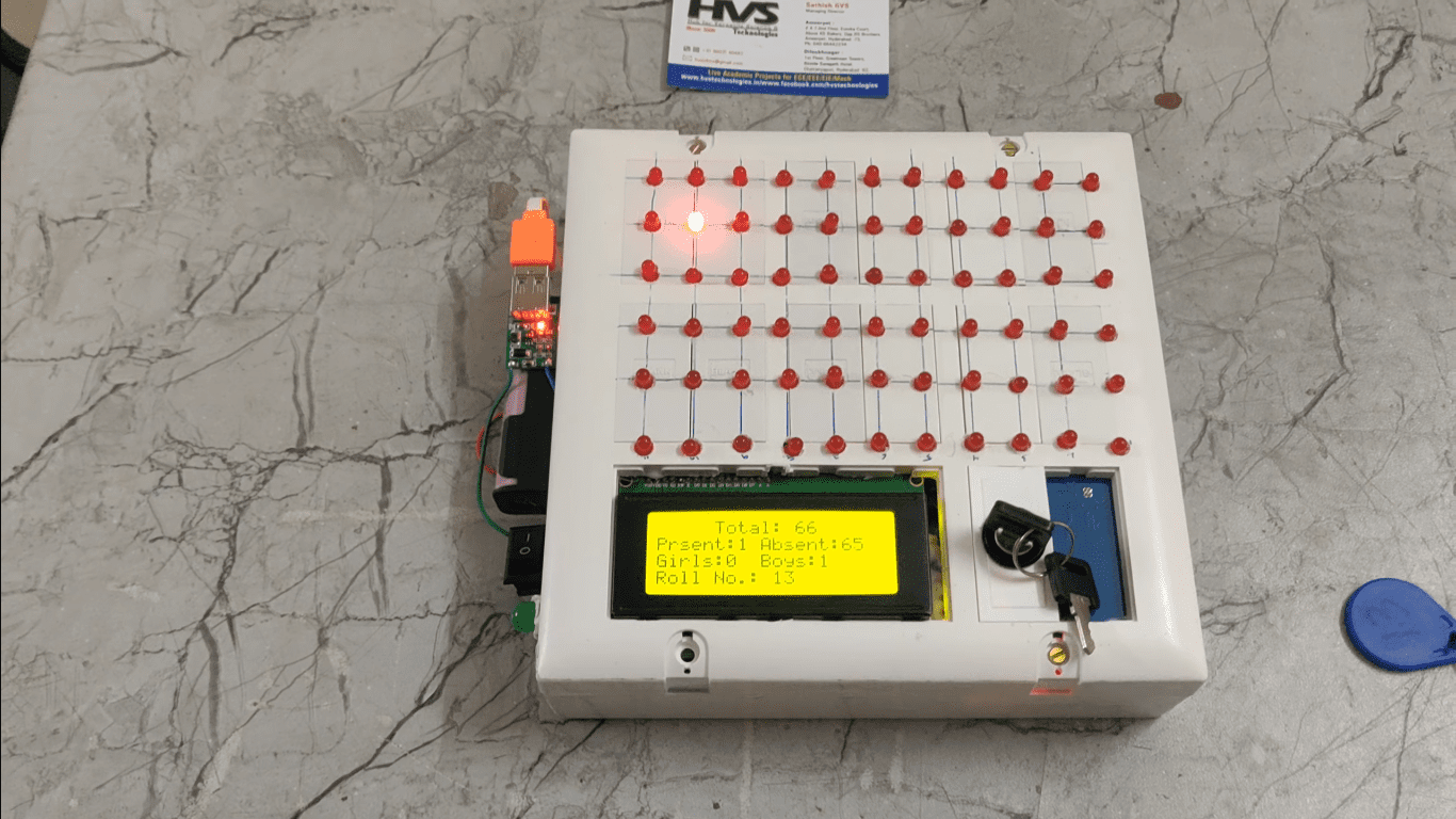 The entire system is powered by a portable battery, making it suitable for mobile or remote applications without the need for constant power connections. This RFID-based system simplifies attendance recording and enhances accuracy while providing a scalable solution for various environments like classrooms, offices, or events.
