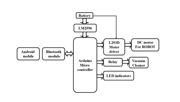 The proposed system consists of three main components: the Arduino microcontroller, a Bluetooth module (such as HC-05), and the vacuum cleaner's motor. The user sends commands via a smartphone application, which communicates wirelessly with the Bluetooth module. The Arduino microcontroller interprets these commands to control various operations of the vacuum cleaner, such as turning the device on or off or changing the direction of movement.