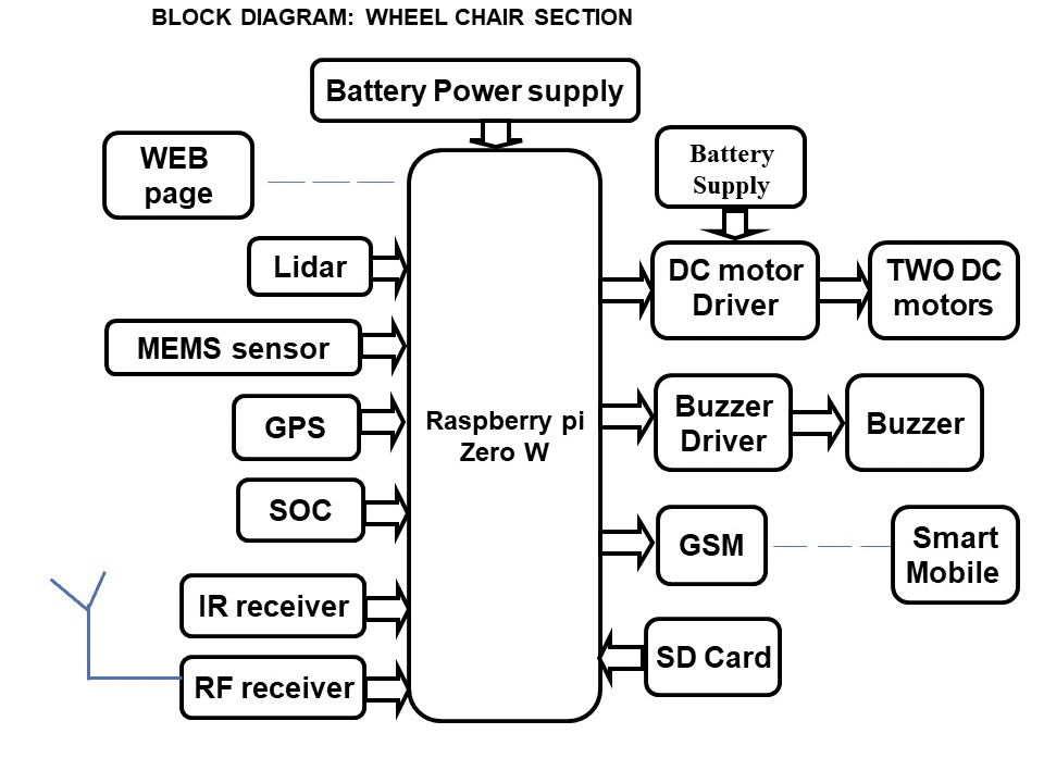 Wheel chair consist of MEMS sensor to detect the fault. IR receiver at wheel chair and IR transmitter at person is used for human following. Lidar is used for autonomous navigation and obstacle avoidance. Raspberry pi zero W has inbuilt wi-fi, if the user selects the location from WEB page, it goes to that location avoiding obstacles. GPS is used for location tracking. SOC is used for emergency intimation. If the user presses the SOC button, wheel chair stops automatically and emergency call goes to the predefine mobile number through GSM and simultaneously the buzzer beeps automatically. As per user request raspberry pi can control the wheel chair using DC motors by using Battery power. In this project we are using PIC microcontroller to read the joystick data and sending this data to the raspberry pi using RF technology. To achieve this task Raspberry pi loaded program written in python language.