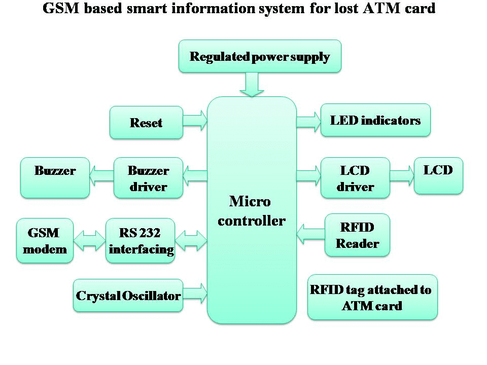 The project aims in designing a security system which is capable of avoiding transactions from lost ATM card. This system makes use of GSM and RFID technology. The ATM card is going to have a RFID tag inside it. The user of lost ATM card needs to send a predefined format SMS to a phone number given by the bank. The bank authorities continuously monitor the ATM transactions and the lost requests from users. Whenever anyone tries to do transaction from a lost ATM card, the location information of the ATM is sent to the user’s mobile automatically along with horning an alarm system at ATM center. This helps in catching the culprit.