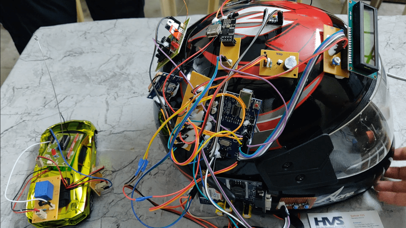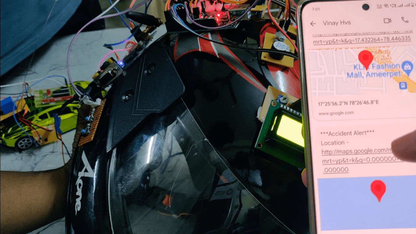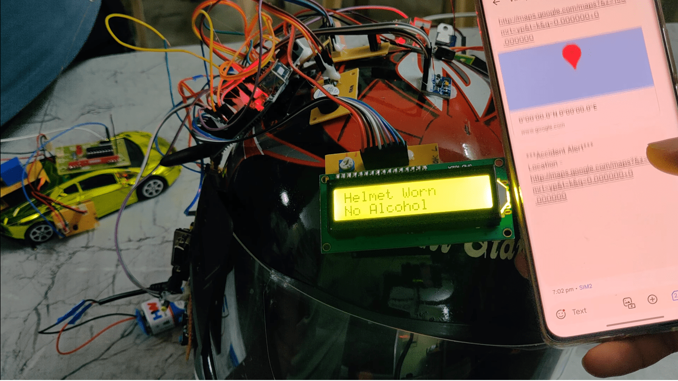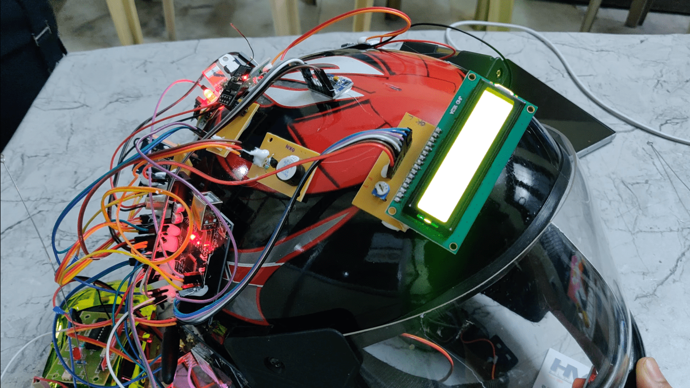 The project aims in designing a smart helmet to provide safety and security to the rider using Arduino UNO. Helmet section: The main controlling device of the project is Arduino UNO Microcontroller. SOS Switch, Switch to disable Accident, RF TX, Module, Alcohol sensor, Accident sensor, GPS, GSM, LCD display, Buzzer, ESP8266 WI-FI Module, Limit switch is interfaced to the microcontroller. This helmet section works with battery power. Vehicle section: Vehicle section consist of vehicle along with RF receiver. The system checks if the helmet is worn using the helmet detection switch. If the helmet is not worn, it will display the message please wear a helmet on LCD. Continuously monitors alcohol levels around the rider. If alcohol is detected, the system gives the audible alert through Buzzer. If Alcohol is not detected, then RF transmitter trigger the vehicle to start. Utilizes the accident sensor to detect sudden impacts or falls. In case of an accident, the system automatically sends an alert SMS/CALL to predefined contacts and also activating the buzzer for alerts. whenever the user calls to the GSM module, it will answer automatically. The SOS switch allows the rider to manually trigger emergency alerts. This could be useful in non-accident emergency situations. The GPS module continuously tracks the location of the helmet wearer, and this information can be accessed through the Blynk app. This system will send the latitude, longitude values and accident intimation into the blynk app. The GSM module facilitates communication by sending SMS alerts or making calls to predefined contacts in case of emergencies. The status of the project will display on LCD. The RF transmitter on the helmet communicates wirelessly with the RF receiver installed on the vehicle. This communication can be used for controlling certain vehicle functions remotely. RF Communication ranges in between 30 KHz to 300 GHz. RF communication works by creating electromagnetic waves at a source and being able to pick up those electromagnetic waves at a particular destination. These electromagnetic waves travel through the air at near the speed of light. The wavelength of an electromagnetic signal is inversely proportional to the frequency; the higher the frequency, the shorter the wavelength.   The action of these instructions is already loaded into the Microcontroller using Embedded C programming. The intelligent control software, which has been developed Embedded C programming language.
