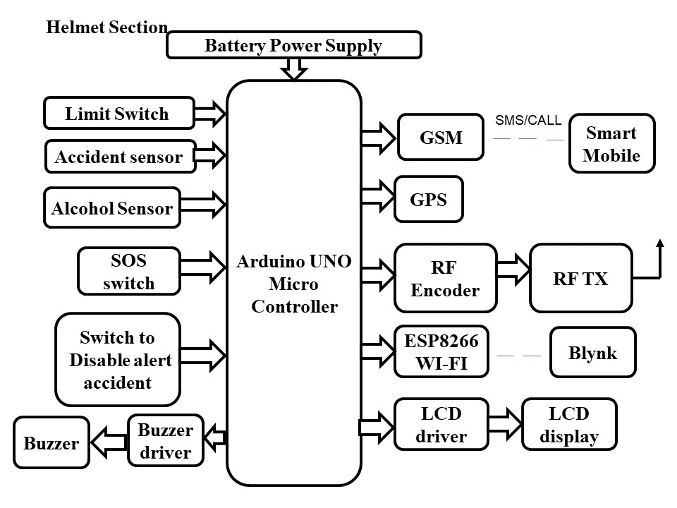Helmet section: The main controlling device of the project is Arduino UNO Microcontroller. SOS Switch, Switch to disable Accident, RF TX, Module, Alcohol sensor, Accident sensor, GPS, GSM, LCD display, Buzzer, ESP8266 WI-FI Module, Limit switch is interfaced to the microcontroller. This helmet section works with battery power.