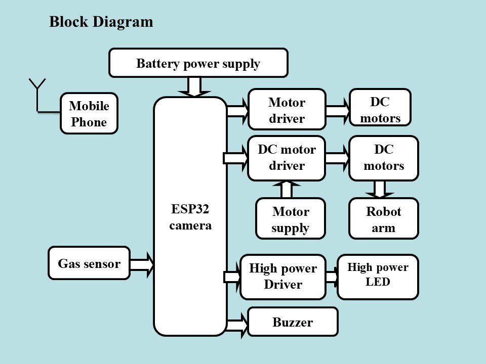 The controlling device for the entire system is the ESP32-CAM module. When the user sends commands through a web browser, the ESP32-CAM, which has inbuilt Wi-Fi, receives the data, interprets the instructions, and controls the robot’s movement and robotic arm accordingly. The live video feed from the camera is streamed to the user’s mobile device, allowing real-time monitoring and control of the robot and arm through the web interface.