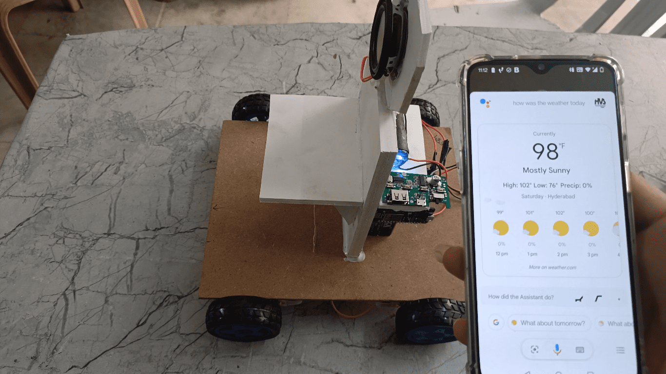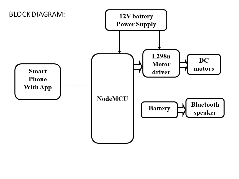 4 BO motors along with L298n motor driver is interfaced to the NodeMCU. When the user presses the button from IOT app. The Nodemcu as inbuilt Wi-Fi module so it receives the data from app and control the robot accordingly. When the user asks the question from bluetoth app, this data received by Bluetooth speaker module and gives the appropriate voice through speaker.