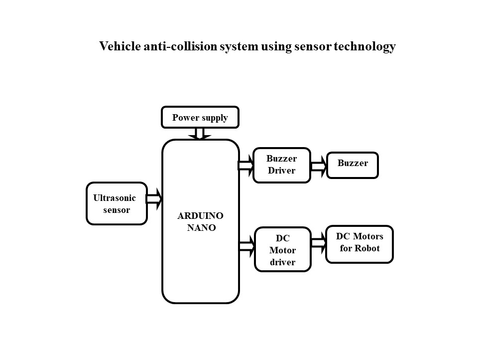 The main aim of this project is to design a vehicle anti-collision system using ultrasonic sensor and Arduino UNO. This is a driver-assistance system used to detect the obstacles using sensor and provide the driver with warnings to help avoid a collision. Ultrasonic sensor is used to detect the obstacles and gives the audible alerts through buzzer. This project makes use of a micro controller, which is programmed, with the help of embedded C instructions. This Microcontroller is capable of communicating with input and output modules. The controller is interfaced with two DC motors along with l293d motor driver, which are fixed to the vehicle to control the direction of the vehicle. The system also includes obstacle sensors to detect the obstacles in its way and stop the vehicle automatically. The main controlling device of the project is Arduino Nano Microcontroller. LCD display, Ultrasonic sensor, Buzzer, DC motors long with L293D motor driver are interfacing to the Arduino nano microcontroller. Ultrasonic sensor is used to detect the obstacle in the path of the vehicle and process this data to the Arduino nano. Then Arduino nano will activate the buzzer for alerts and stop the vehicle accordingly. To moves the vehicle using 12V rechargeable battery. To achieve this task microcontroller loaded program written in embedded C language.