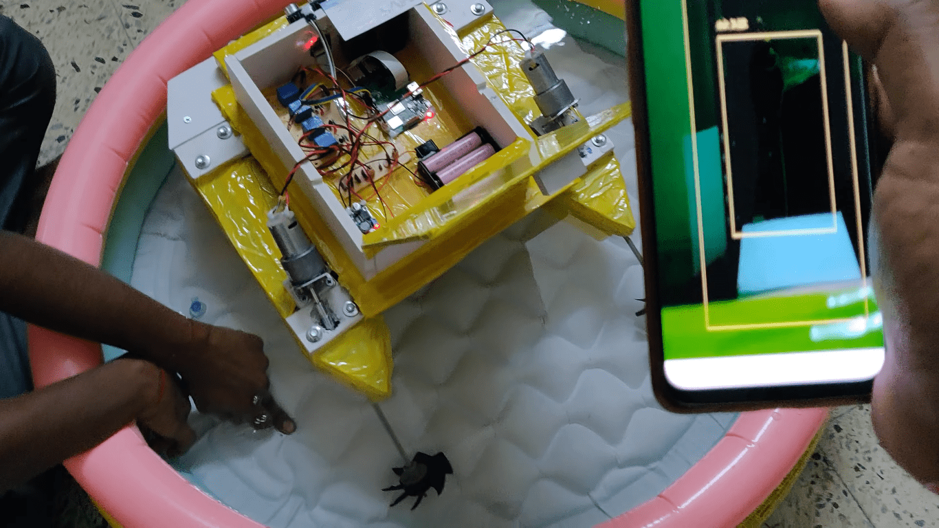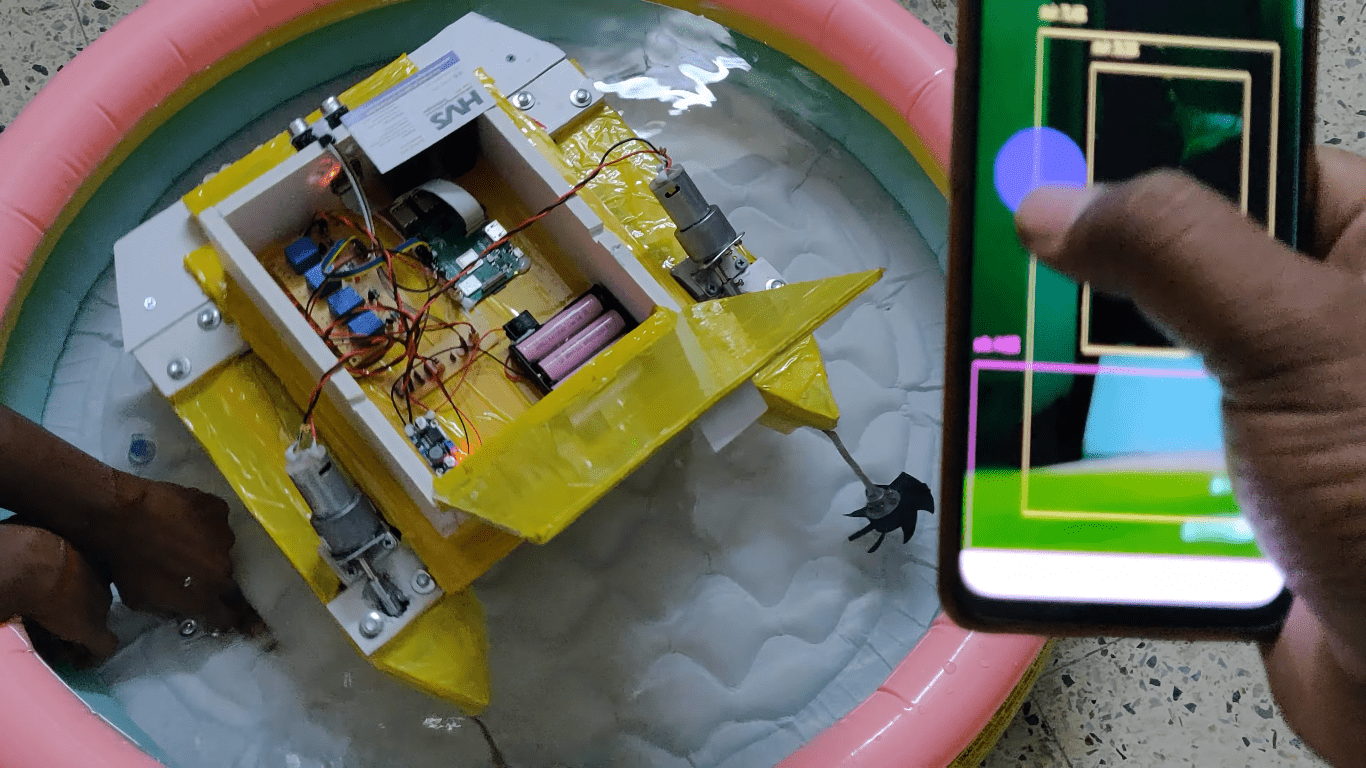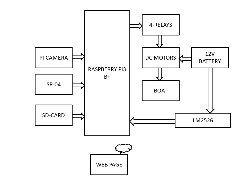 This BOAT is designed in such a way. It makes use of the ultrasonic sensors to detect the obstacle present in, if the boat detects the obstacle, it will stop automatically. DC motors along with spin are used to moves the boat which is connected to the raspberry pi through relays. Based on the user instruction raspberry will control the boat accordingly.