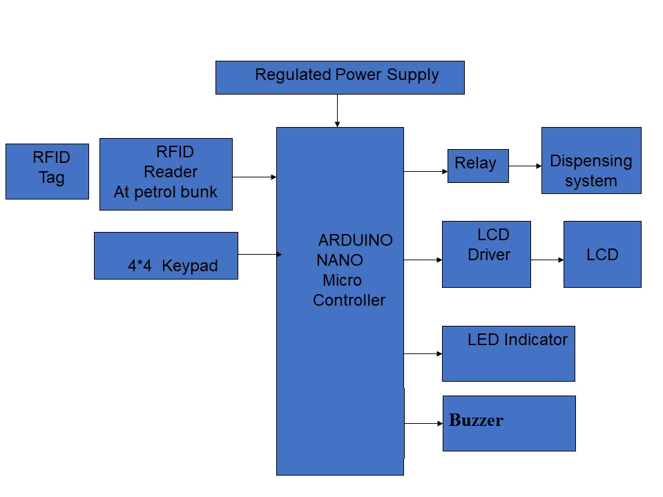 The project makes use of an Arduino Nano microcontroller, which acts as a central controlling unit. This module is capable of communicating with the input and the output modules. The user initially has to deposit money, save time in the cards number. The input module is the RFID reader which decodes the RFID tag and it will give to the controller. By using 4*4 keypad user enter the amount for fuel based on amount the system dispensing the petrol. After completion of petrol filling process, the information of the remaining balance of the RFID card will be display on LCD. And when wrong tag was detected then buzzer will on. Based on the amount, microcontroller will switch ON/OFF the motor through relay. Here relay works as a switch to on/off the motor. Here we are using water instead of petrol. So, the motor pump the petrol at particular time which is saving in that card and automatically reduce the money from that card. The status of the project will display on LCD. The Microcontroller is programmed using Embedded C language.