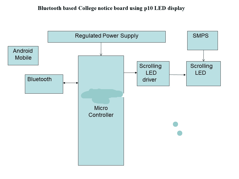 The main controlling device of the whole system is an ATMEGA328 Microcontroller. Bluetooth modem and scrolling LED display are interfaced to Microcontroller. The TEXT-based command fed to android smart phone will be transmitted over phone’s Bluetooth. This information will be received by the Bluetooth modem which is connected to microcontroller. Microcontroller will scroll this message on the p10LED display. To perform the task, Microcontroller is loaded with an intelligent program written in embedded ‘C’ language.