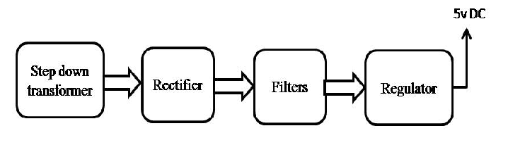 This project uses regulated 5V, 500mA power supply. Unregulated 12V DC is used for relay. 7805 three terminal voltage regulator is used for voltage regulation. Bridge type full wave rectifier is used to rectify the ac out put of secondary of 230/12V step down transformer.