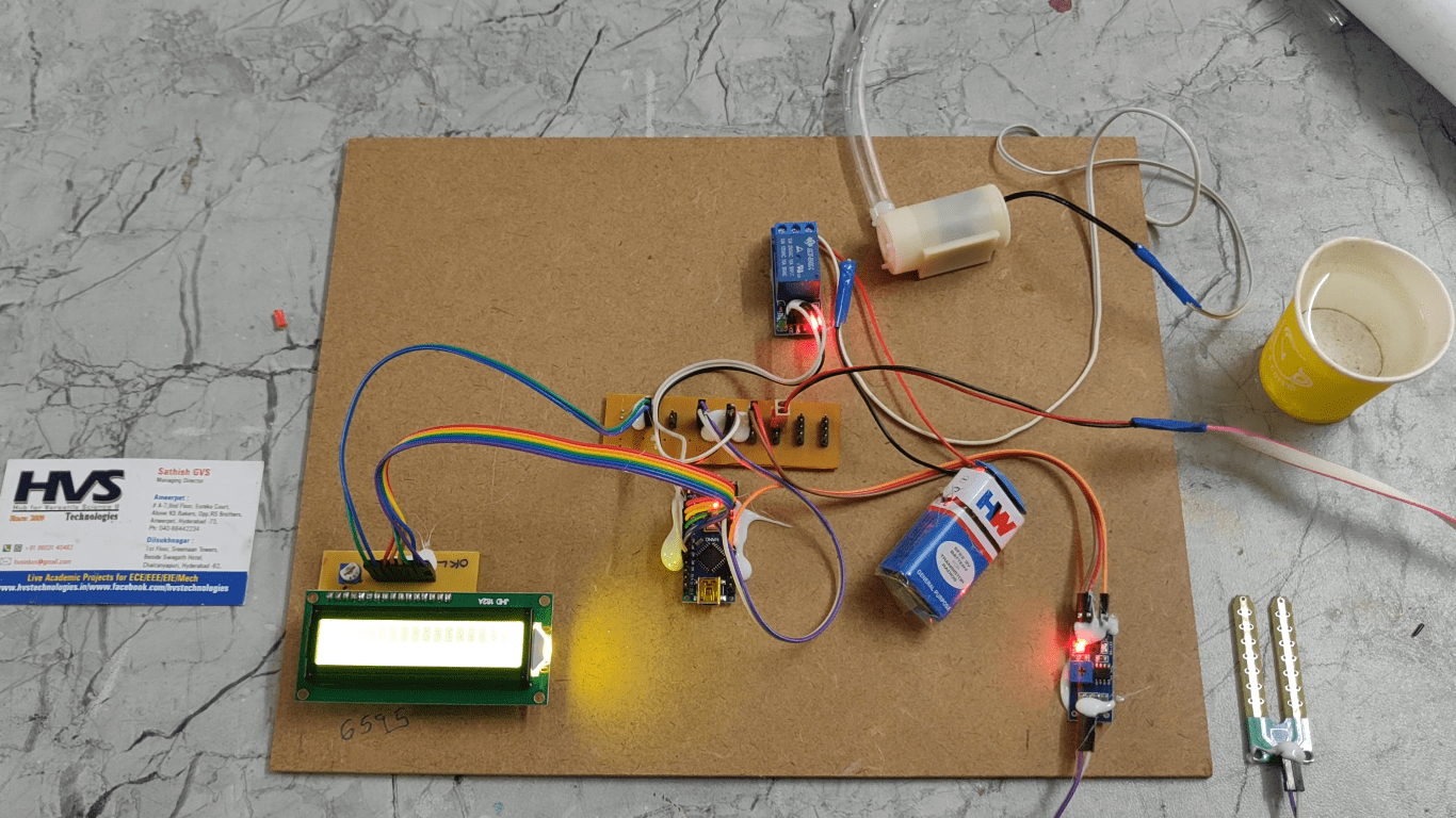 The system makes use of an Arduino nano microcontroller. Soil moisture sensor, water motor along with relay and LCD display are interfaced to the Arduino nano. The microcontroller will continuously compare output from soil moisture sensor. When there is no moisture in soil then microcontroller will turn ON the water motor through relay. There is sufficient water in soil microcontroller will turn OFF the water motor automatically. Here relay works as switch to ON/OFF the water motor. The status of the project will display on LCD. The Arduino nano is loaded with a program written in embedded ‘C’ language to perform the task.