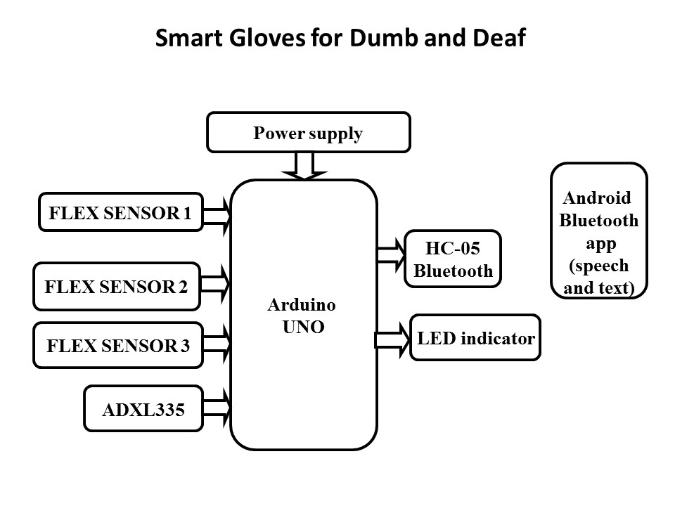 The whole system is controlled by Arduino. There are 3 Flex sensors, MEMS sensor and HC-05 Bluetooth module is interfaced to Arduino. All these components are placed on the glove which is operated with 9VDC battery power. User wear this glove to his/her hand. By using simple hand gesture, user will express their needs like water, food…The Arduino sends these commands to the Bluetooth application via HC-05 Bluetooth module which announces the voices and display the text.