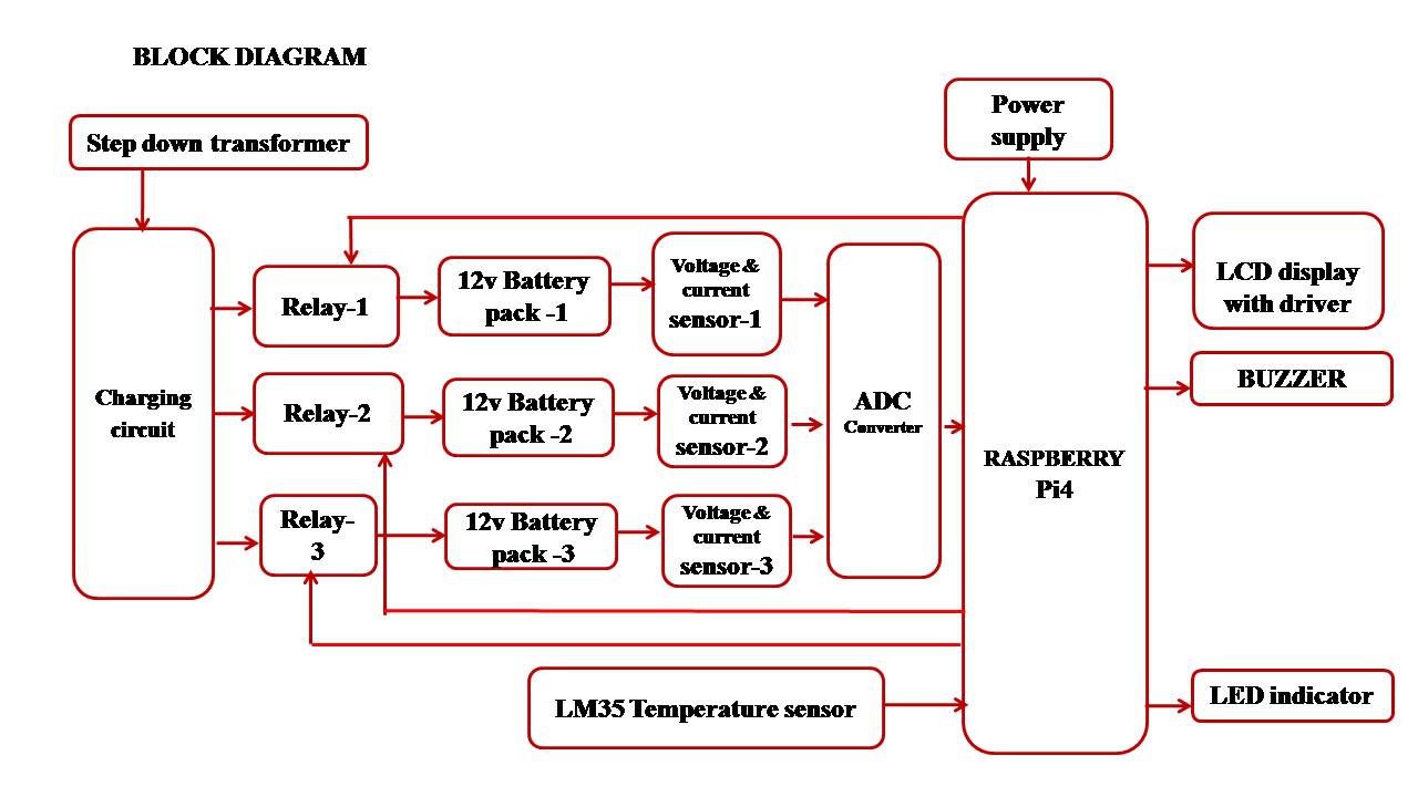 The Raspberry Pi4 measure the SOC (State-of-Charge) and (SoH) State-of-Health from voltage sensors and based on that it will switch ON/OFF the relays for battery charging. Here relay works as a switch to ON/OFF the charging connection. And also, it will display the voltage, current, temperature, SOC and SOH values on LCD module. It will activate the buzzer if the sensor data exceed threshold value.
