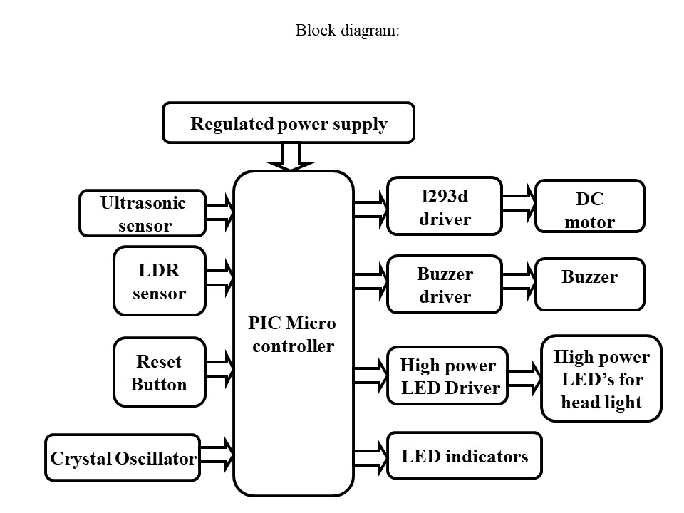 This system uses SR04 Ultrasonic sensor to detect the obstacle, LDR is uses to control the light intensity of vehicle and it measure the light intensity of opposite vehicle. These systems will active the buzzer; when the sensor detects the obstacle. DC motor is used to movies the vehicle.