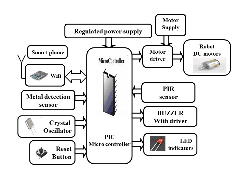 The controlling device of the whole system is a Microcontroller to which ESP8266 Wi-Fi module, PIR sensor, Buzzer, metal detector sensor, and DC motors are interfaced. We can control the robot using smart phone through Wi-Fi. Whenever, user sending a command from smart phone this data is received the Wi-Fi module which is connected to the microcontroller. The Microcontroller processes this data and acts accordingly on Robot motors. If the robot detects the human presence or Bomb, it can alert the persons through Buzzer. The Microcontroller is programmed using Embedded C language.