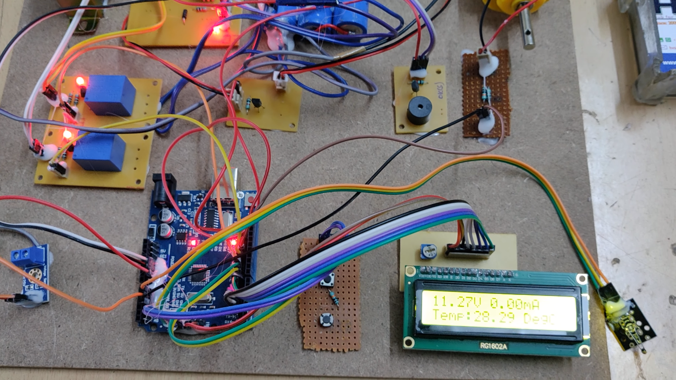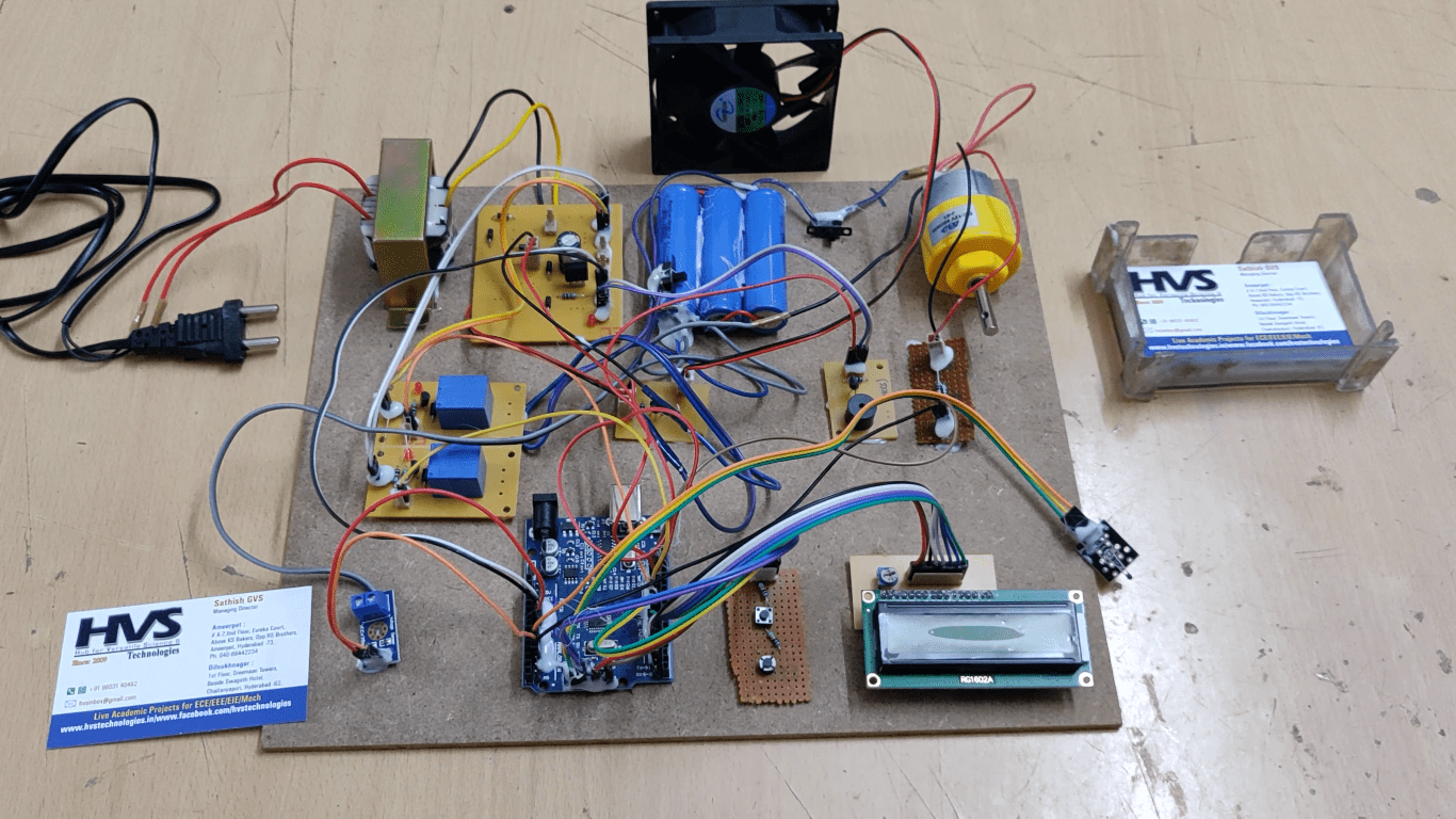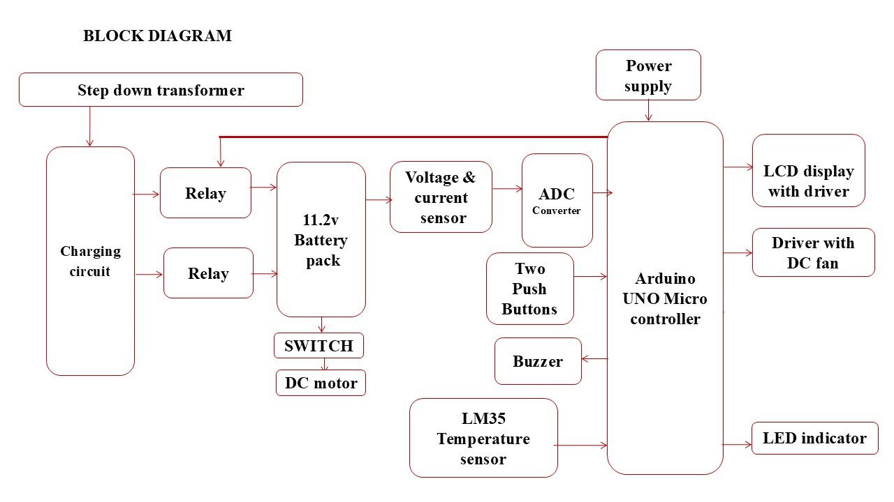 The controlling device of the whole system is ARDUINO UNO microcontroller. The integrated modules to the controller are temperature sensor, Battery pack along with relays, Charger and LCD Module. When the battery pack gets drained, it will charge through relays. Here we are using two relays for fast and slow charging. Here DC MOTOR works as a vehicle. While running the vehicle microcontroller will display the voltage and current values on LCD module as well as it displays the temperature continuously. If the temperature value crosses the set limit, then microcontroller active the buzzer for alerts. Based on the battery voltage it will charge the battery in two modes like fast and slow. Here relay works as a switch to on/off the charging connection. The Microcontroller will calculate the SOC (State-of-Charge) and (SoC) State-of-Health from voltage sensors will be display on LCD module. To achieve this task microcontroller loaded program written in embedded C language.
